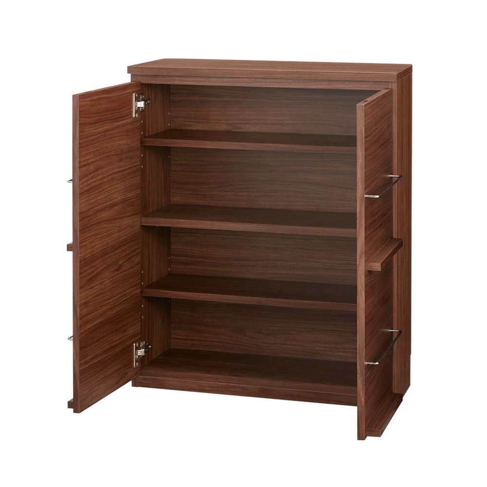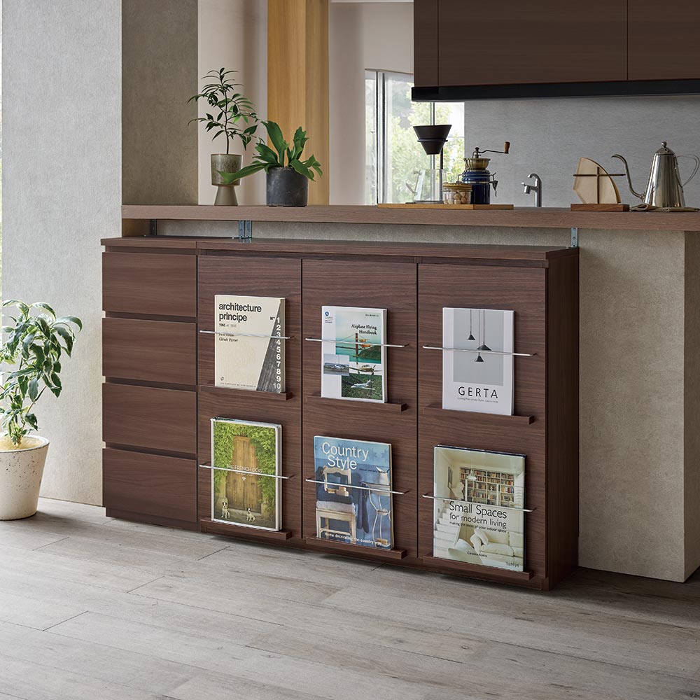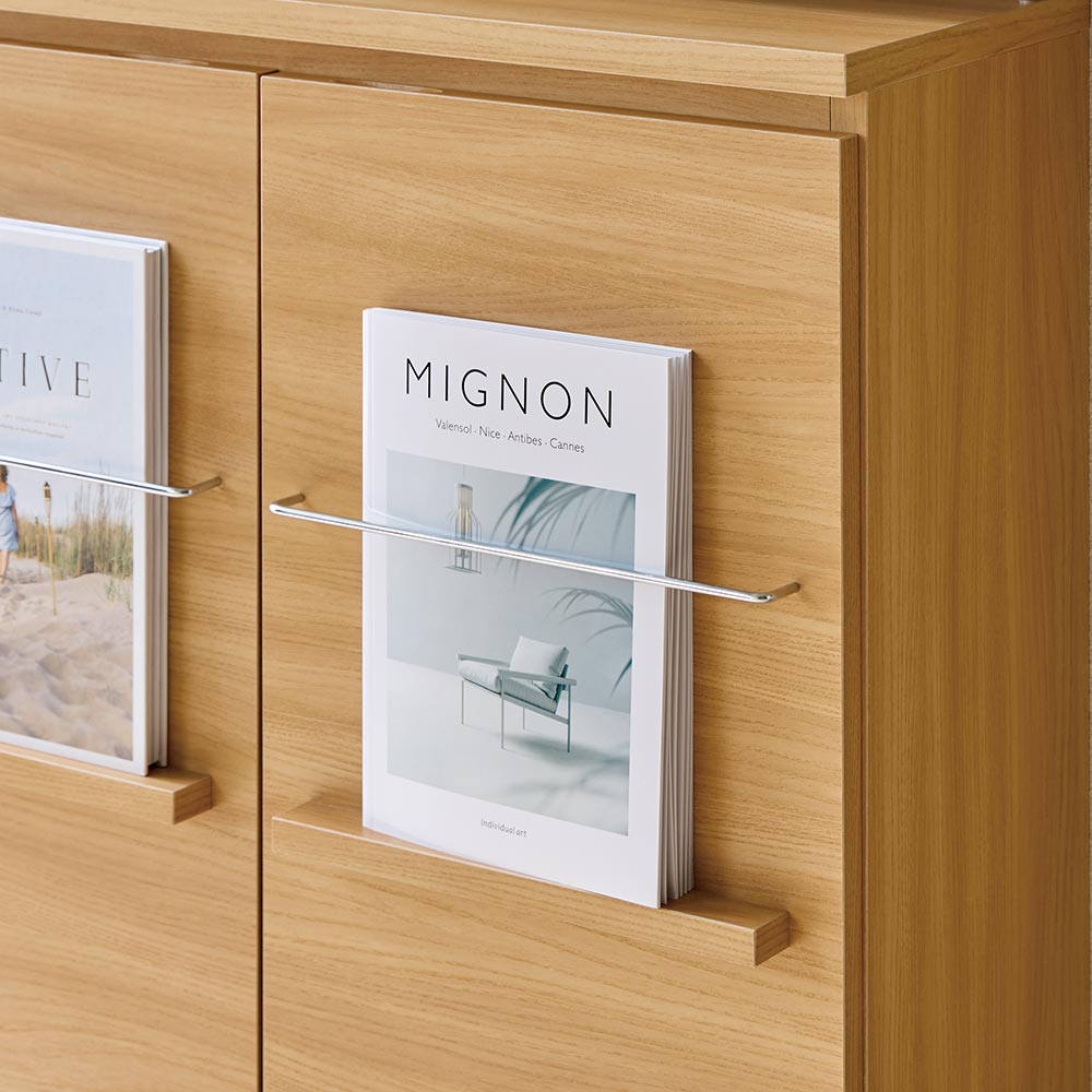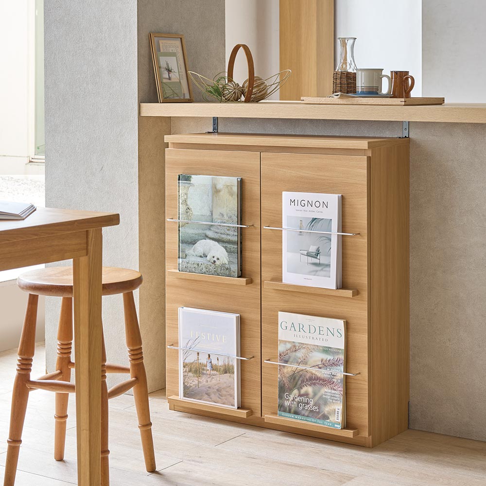 薄型だからお部屋のスペースをとらず、収納もディスプレイも叶えます。お気に入りの本や雑誌をおしゃれにディスプレイ♪薄型なのに中には散らかる小物を詰め込める開き戸省スペースで「見せる」と「隠す」の両方を叶える収納です。本を飾れるブックラックと、散らかりがちな小物を収納できる収納を両立。コンパクトなお部屋でもディスプレイと収納が実現します!こんなの探してた!奥行が薄くて部屋を広く使えるコンパクトな収納!奥行25cmのスリム設計でお部屋のどこに置いても窮屈な感じがなく、スペースを有効に使えます。収納したものが一目でわかる開き扉は、引き戸やフラップ扉と比べて中の収納スペースを大きく取れます。扉部分はマガジンラックになっているので、お気に入りの雑誌やよく読む本を飾りながら、洗練された収納インテリアを演出します。サイズは2種類、同シリーズの引き出しと並べたら収納力もUP!高さは85cmで、本を4冊ディスプレイできる72cm幅と、6冊ディスプレイ可能な107cm幅から選べます。7.5cm×1cmの幅木カットがあるので、壁にぴったり寄せて設置可能。寝室や廊下に並べても圧迫感がなく、同シリーズの引き出しと並べれば、収納力がさらにパワーアップ。見せたくないものをしっかり隠せます。3cm間隔5段階の可動棚が2枚、転倒防止金具もついて安心2枚の可動棚は3cm間隔で5段階の高さ調節が可能。小物を無駄なく収納でき、転倒防止金具も付属しているので、安全に設置できます。安心の「F☆☆☆☆」仕様、ナチュラルとブラウンの2色展開国内の工場で職人が一つずつ丁寧に仕上げたこの商品は、有害物質ホルムアルデヒドの発散濃度が最も低い「F☆☆☆☆」仕様。カラーは優しい木目のナチュラルとブラウンの2色展開で、どんなインテリアにも馴染みます。組み立て不要の完成品でお届けします。