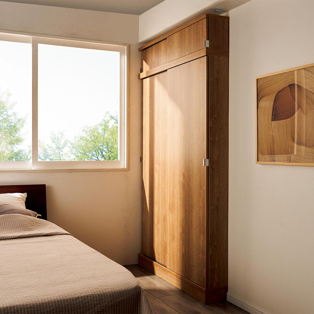 (イ)ブラウン 開閉スペースを取らない引き戸、薄型設計、1cmピッチの可動棚など、限られたスペースを有効活用するための知恵を集めました。