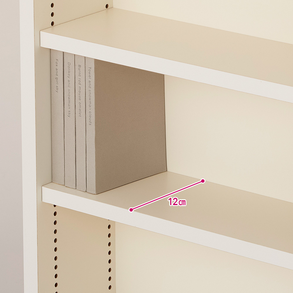 使用イメージ(ア)ホワイト 廊下に置いても邪魔にならない薄型設計。1cmピッチで棚板を調節できるので、大小様々な物をムダなく収納できます。 ※写真は別売りの本体幅87cm奥行19.5cmです。