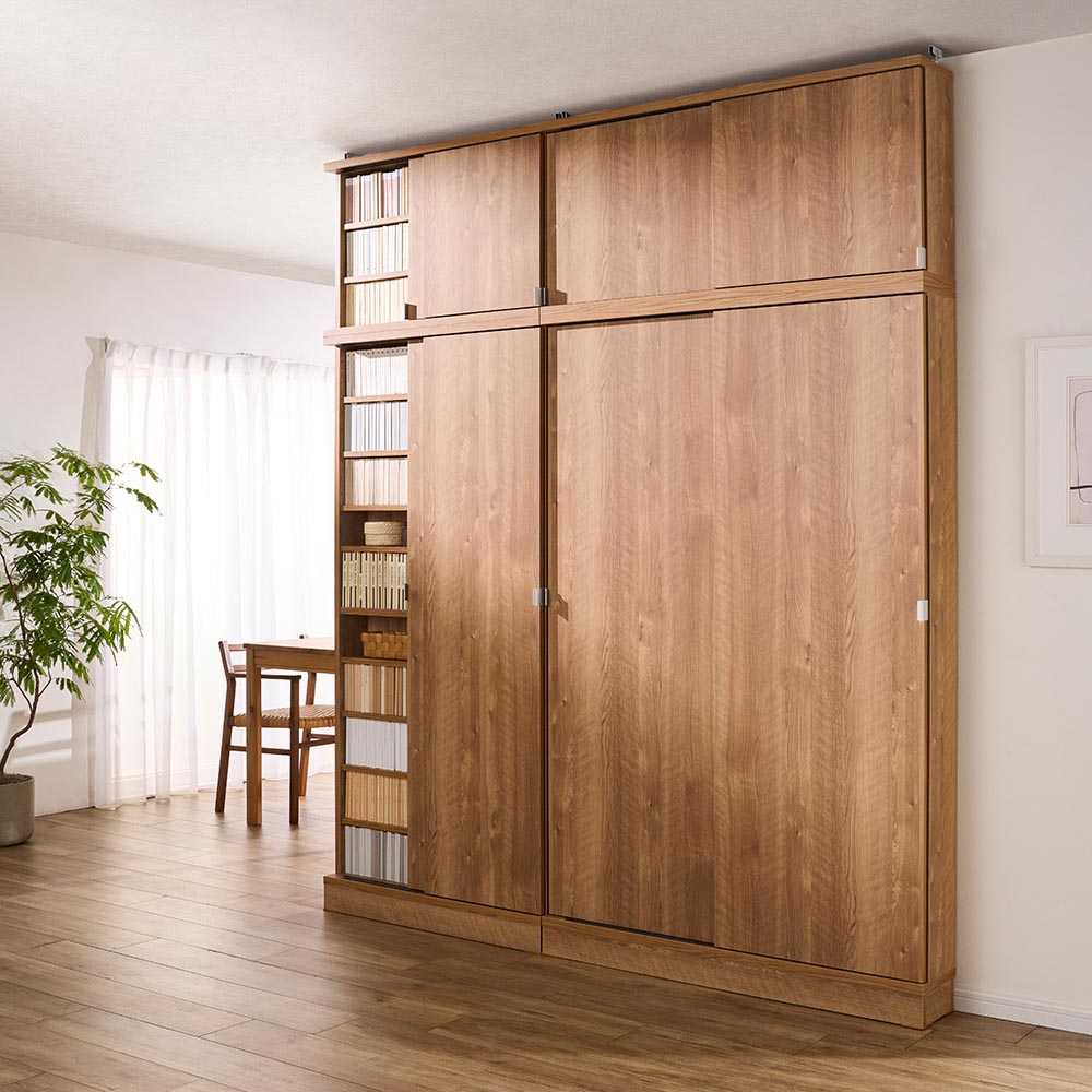 コーディネート例(イ)ブラウン 省スペース&効率収納の最適解。収納物を選ばない1cmピッチの細かな棚板設定ができるので、効率よく大量収納が可能です。 ※写真は本体幅117cm奥行19.5cm、別売りの本体幅87cm奥行19.5cm、上置きの組み合わせです。(天井高さ240cm)
