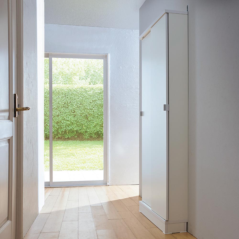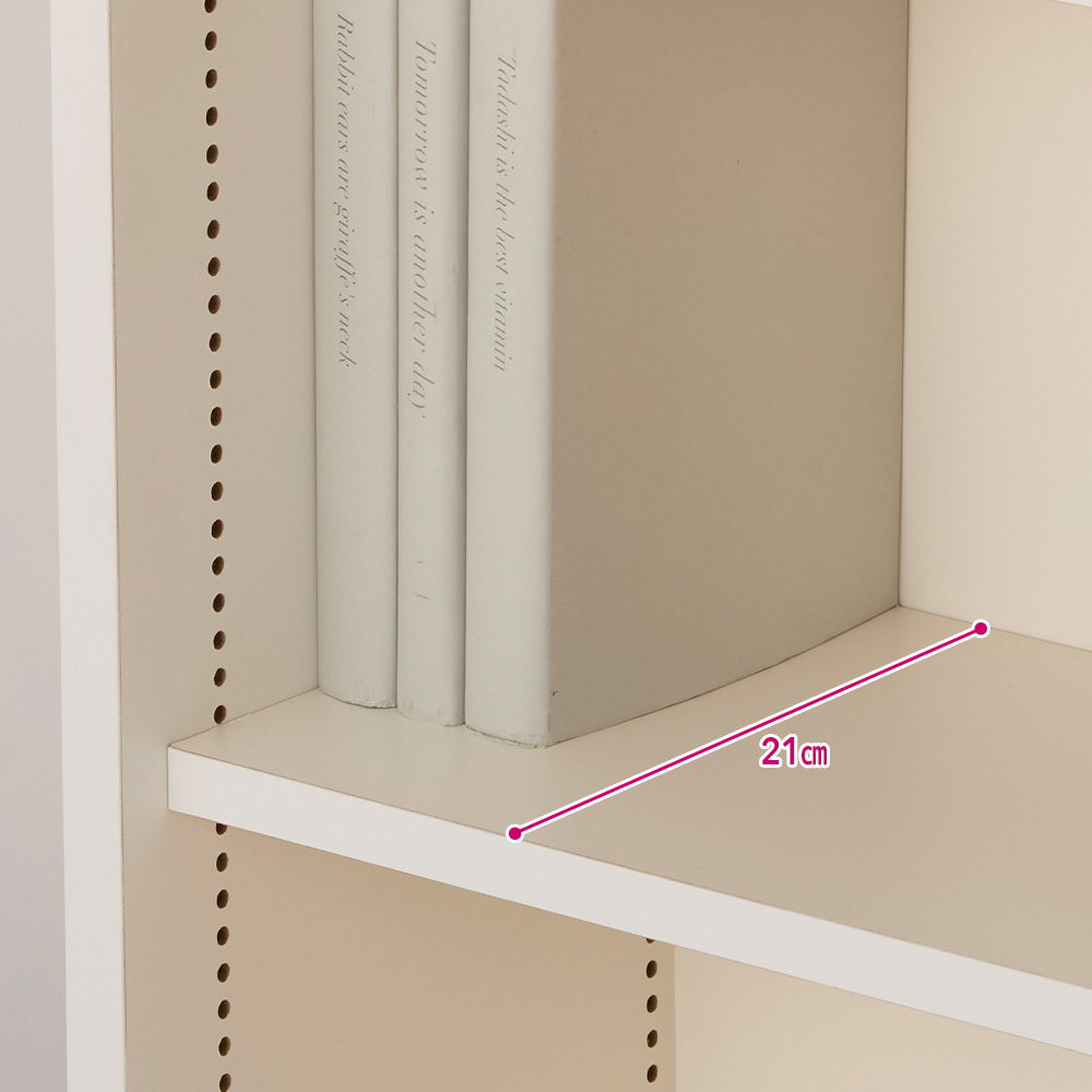 使用イメージ(ア)ホワイト 廊下に置いても邪魔にならない薄型設計。1cmピッチで棚板を調節できるので、大小様々な物をムダなく収納できます。 ※写真は別売りの本体幅87cm奥行19.5cmです。