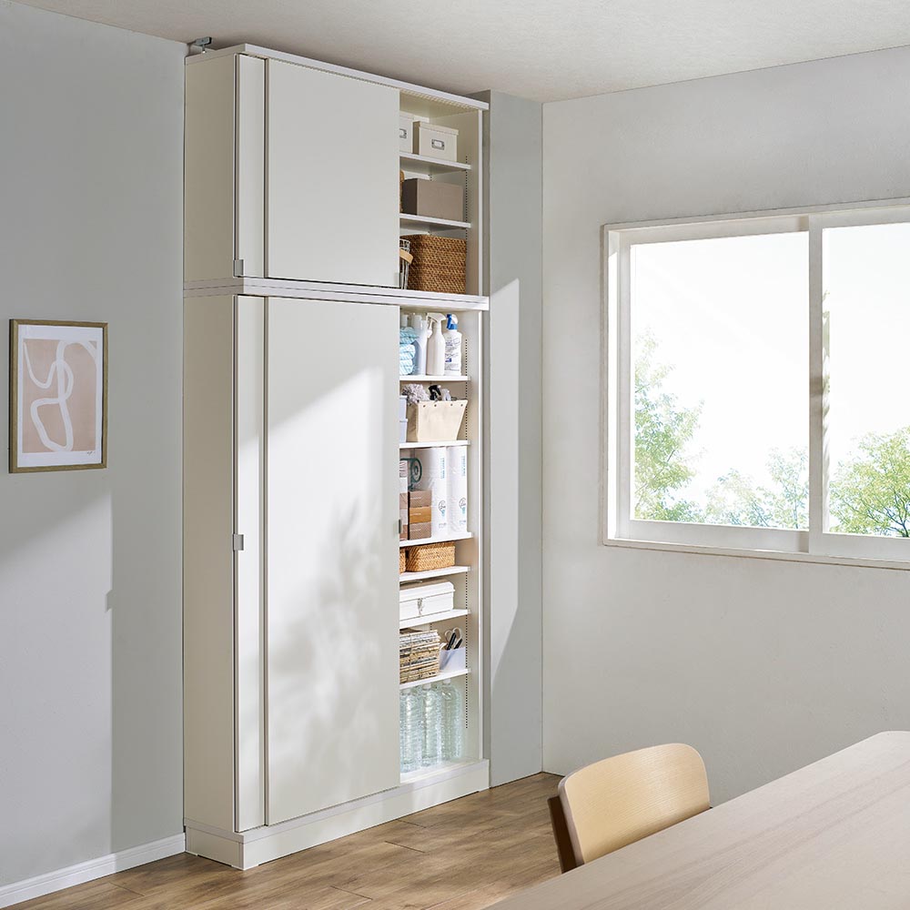 コーディネート例(ア)ホワイト 省スペース&効率収納の最適解。収納物を選ばない1cmピッチの細かな棚板設定ができるので、効率よく大量収納が可能です。 ※写真は本体幅117cm奥行29.5cm、別売りの上置きの組み合わせです。(天井高さ260cm)