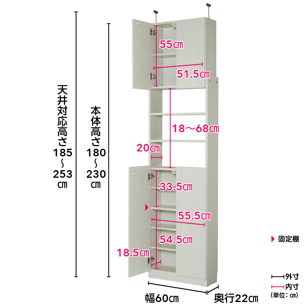 上段のキャビネットが昇降して、天井高にぴったりの大量収納を可能に。天井突っ張り式と耐震ラッチで、地震対策としてもオススメです。天井高に合わせてキャビネットが昇降写真は幅60cm奥行37cmタイプ(ア)ホワイト木目上段のキャビネットが昇降する突っ張り式キャビネット。天井高にぴったりの大量収納を可能にします。扉内には大切な物を収納して写真は幅80cm奥行22cmタイプ(イ)ナチュラル物が多いお部屋でも、扉を閉じればスッキリ。日焼けやホコリから守ってくれるので、大切な本やコレクションの収納にも。引っ越しや模様替えにも対応上部のキャビネット自体が昇降し、天井高を活かした大量収納が実現。引っ越しや模様替えにもフレキシブルに対応できます。地震対策としても安心な天井突っ張り式天井や梁の高さに合わせてキャビネットが昇降。突っ張り金具でしっかり固定でき、地震対策としても有効です。見せる収納が楽しめる中央オープン部写真は幅60cm奥行22cmタイプ(ア)ホワイト木目オープン部は背板がないのでモニターを避けて設置ができ、配線が必要なAV機器も壁側コードを通せるので設置が可能。お部屋に合わせて幅と奥行き、カラーが選べます写真左から幅60cm奥行22cm、幅60cm奥行37cm、幅80cm奥行22cm、幅80cm奥行37cmどんな家にもぴったり合う耐震昇降キャビネットシリーズは、幅は60cm、80cm、奥行は22cm、37cmの計4タイプ。色はホワイト木目、ナチュラルの2色展開で、お部屋に合わせてお選びいただけます。可動棚板で収納物に合わせた効率収納が可能写真左:幅60cm奥行22cm(ア)ホワイト木目 写真右:幅80cm奥行37cm(イ)ナチュラル収納物に合わせて高さを変えられる可動棚。下台と中段オープン部は棚板が共通なので、自由に付け替え可能です。差し込み式のダボで可動棚板を設置写真左:扉内、写真右:オープン部扉内は3cmピッチ、オープン部は6cmピッチで棚板の高さ調節が可能。棚受けは差し込み式のダボで、設置も移動も簡単です。スマートに配線できるコード穴付きコード穴と棚板後部のすき間からコードが通せるので、配線が必要なデジタル機器もスマートに設置できます。地震時にも安心な耐震ラッチを採用揺れを感知してロックがかかる耐震ラッチを採用。収納した物が飛び出しにくく、地震時にも安心です。