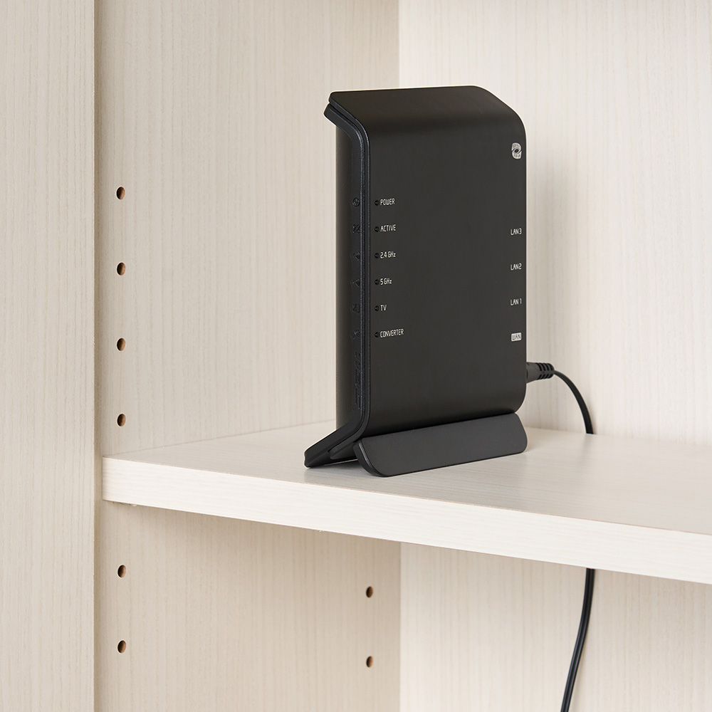 扉内の棚板奥には1cmのすき間があるので、モデムやルーターなどのコードを上下に通せます。