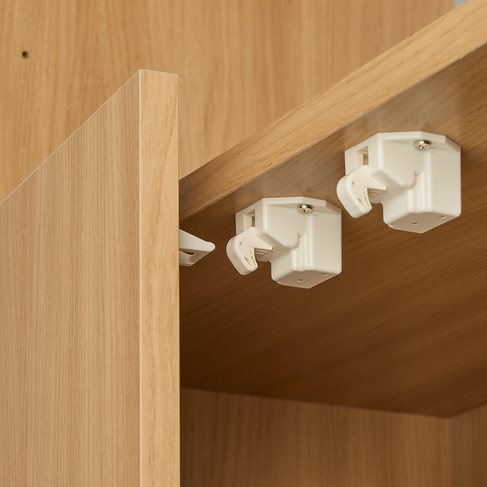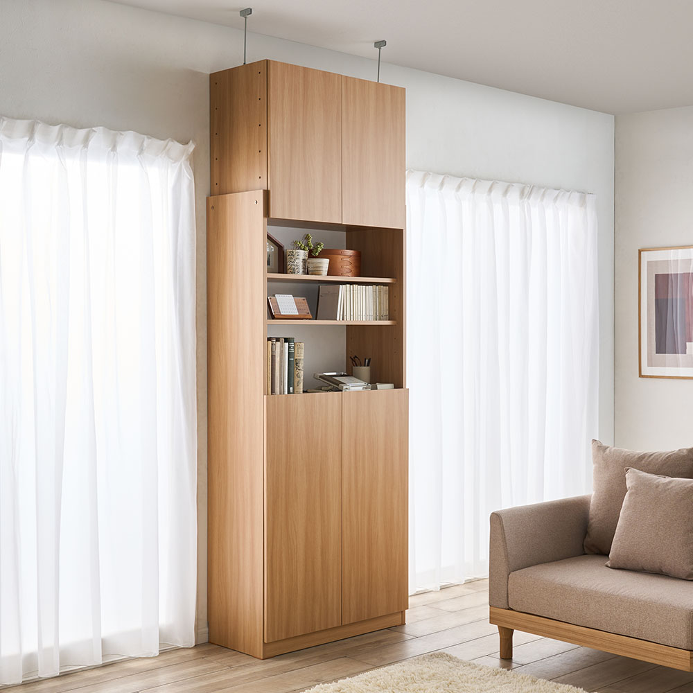 上段のキャビネットが昇降して、天井高にぴったりの大量収納を可能に。天井突っ張り式と耐震ラッチで、地震対策としてもオススメです。天井高に合わせてキャビネットが昇降写真は幅60cm奥行37cmタイプ(ア)ホワイト木目上段のキャビネットが昇降する突っ張り式キャビネット。天井高にぴったりの大量収納を可能にします。扉内には大切な物を収納して写真は幅80cm奥行22cmタイプ(イ)ナチュラル物が多いお部屋でも、扉を閉じればスッキリ。日焼けやホコリから守ってくれるので、大切な本やコレクションの収納にも。引っ越しや模様替えにも対応上部のキャビネット自体が昇降し、天井高を活かした大量収納が実現。引っ越しや模様替えにもフレキシブルに対応できます。地震対策としても安心な天井突っ張り式天井や梁の高さに合わせてキャビネットが昇降。突っ張り金具でしっかり固定でき、地震対策としても有効です。見せる収納が楽しめる中央オープン部写真は幅60cm奥行22cmタイプ(ア)ホワイト木目オープン部は背板がないのでモニターを避けて設置ができ、配線が必要なAV機器も壁側コードを通せるので設置が可能。お部屋に合わせて幅と奥行き、カラーが選べます写真左から幅60cm奥行22cm、幅60cm奥行37cm、幅80cm奥行22cm、幅80cm奥行37cmどんな家にもぴったり合う耐震昇降キャビネットシリーズは、幅は60cm、80cm、奥行は22cm、37cmの計4タイプ。色はホワイト木目、ナチュラルの2色展開で、お部屋に合わせてお選びいただけます。可動棚板で収納物に合わせた効率収納が可能写真左:幅60cm奥行22cm(ア)ホワイト木目 写真右:幅80cm奥行37cm(イ)ナチュラル収納物に合わせて高さを変えられる可動棚。下台と中段オープン部は棚板が共通なので、自由に付け替え可能です。差し込み式のダボで可動棚板を設置写真左:扉内、写真右:オープン部扉内は3cmピッチ、オープン部は6cmピッチで棚板の高さ調節が可能。棚受けは差し込み式のダボで、設置も移動も簡単です。スマートに配線できるコード穴付きコード穴と棚板後部のすき間からコードが通せるので、配線が必要なデジタル機器もスマートに設置できます。地震時にも安心な耐震ラッチを採用揺れを感知してロックがかかる耐震ラッチを採用。収納した物が飛び出しにくく、地震時にも安心です。