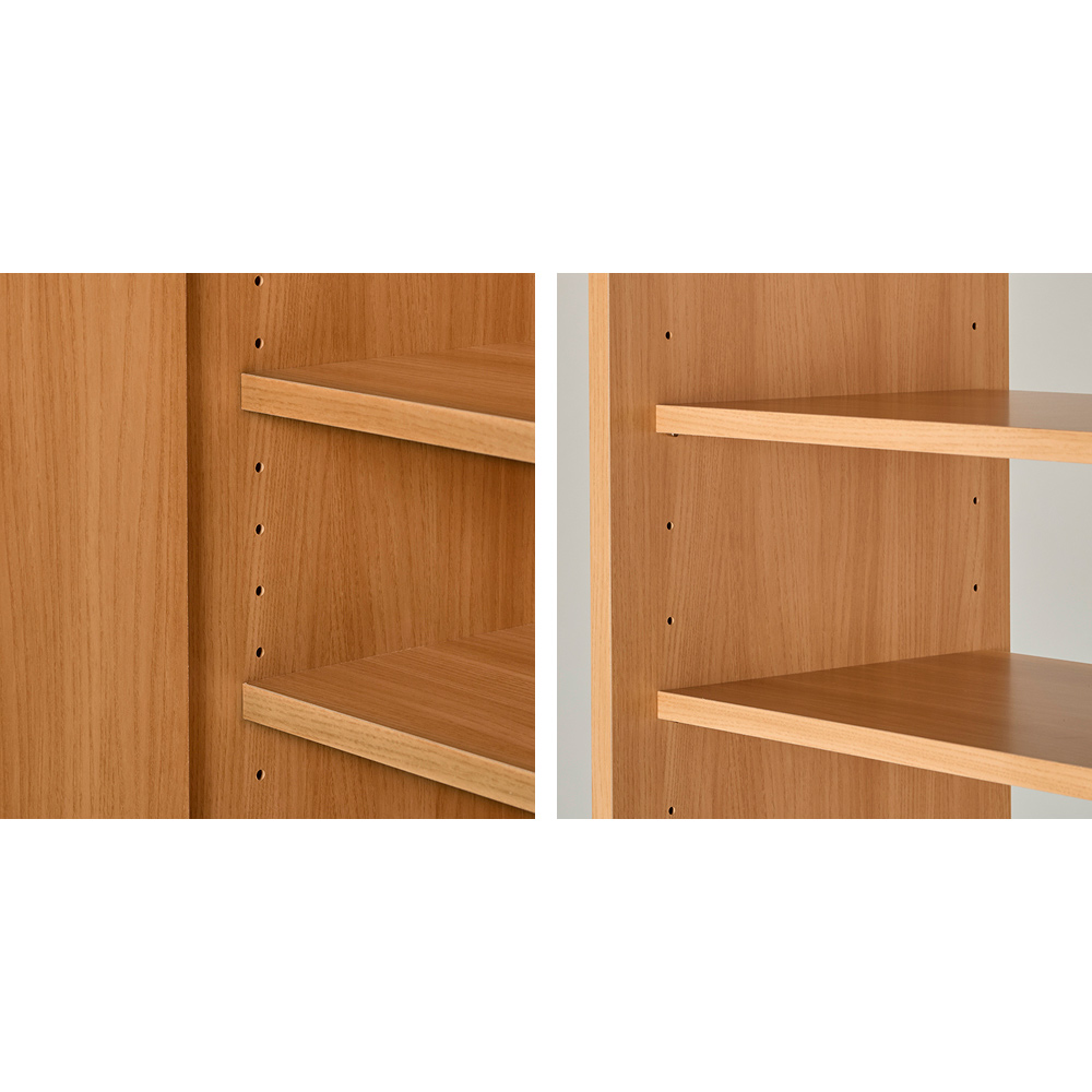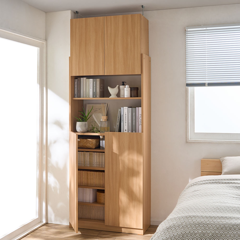 (イ)ナチュラル 【寝室にも】天井高に合わせて上棚の高さを自由に変更可能。設置場所を変えても使用できるので、長くご使用いただけます。日焼けやホコリから収納物を守る扉付き。