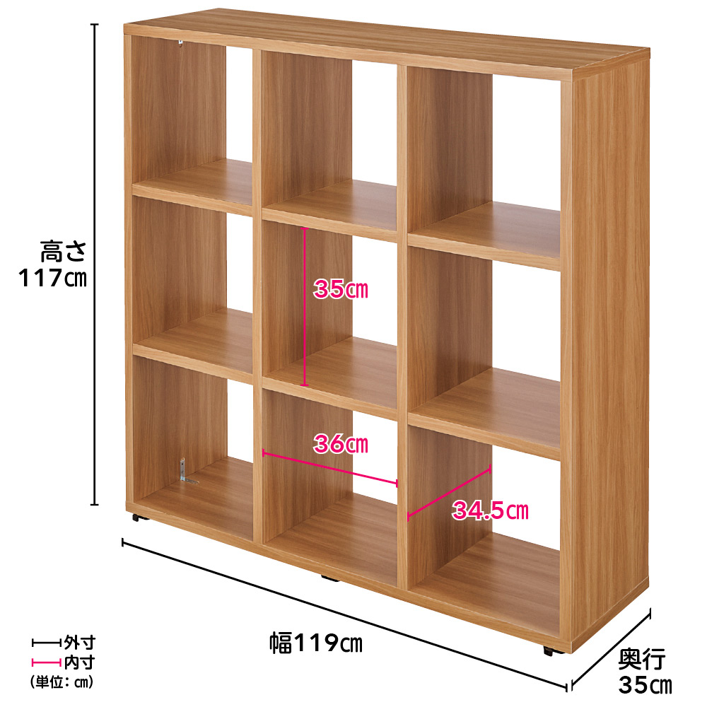 限られたスペースをおしゃれに活用できる、スクエアデザインの多機能ラック。キャスター付きで、使用シーンがグンと多彩に。多彩なシーンで活躍するスクエアデザインの多機能ラック幅119cm高さ80cmタイプ(イ)ナチュラル「見せる」「仕切る」「運ぶ」を叶える多機能ラック。人気のスクエアデザインで、限られたスペースをおしゃれに活用できます。お部屋に合わせてサイズとカラーが選べます左上:幅80cm高さ80cm 右上:幅119cm高さ80cm 左下:幅80cm高さ117cm 右下:幅119cm高さ117cmキャスター付きオープンラックシリーズ商品は、幅は80cm、幅119cmの2タイプ。高さは80cm、幅117cmの2タイプ。色はホワイト木目とナチュラルの2色展開で、お部屋に合わせてお選びいただけます。国内メーカーが丁寧に仕上げて完成品でお届けしますので、届いたらすぐお使いいただけます。ホワイト木目の優しい素材感も魅力幅80cm高さ80cm(ア)ホワイト木目ホワイト木目の質感が優しいオープンシェルフ。ボックスをフレームに見立てて、1枚の静止画を描くようにディスプレイが楽しめます。 ※1マスの内寸は全型共通です。ほどよく仕切りたいワンルームにもオススメ幅119cm高さ117cmタイプ(イ)ナチュラルベッドスペースやデスクコーナーをほどよく仕切って、ワンルームを上手にゾーニングできます。お子さまの成長に合わせた使い方の変化にも対応写真左から幅80cm高さ117cmタイプ、幅119cm高さ117cmタイプ(ア)ホワイト木目ストッパー付きキャスターで、子ども部屋の役割の変化にもフレキシブルに対応。複数台並べても統一感があります。訪れる人の視線を集めるディスプレイスペースとして幅80cm高さ80cm(ア)ホワイト木目ディスプレイが映えるシンプルなデザインも魅力。背板がないので壁の前に置いてもスイッチやコンセントが使えます。スムーズに動いて、掃除や模様替えもラクラク高さ約1.8cmのブラインドキャスターを採用。収納したままスムーズに動き、掃除や模様替えがラクで、必要に応じてストッパーが掛けられます。光と風が通る軽やかさとナチュラルな質感を楽しんでホワイト木目の優しい質感を楽しみながら、両サイドから収納を利用できます。