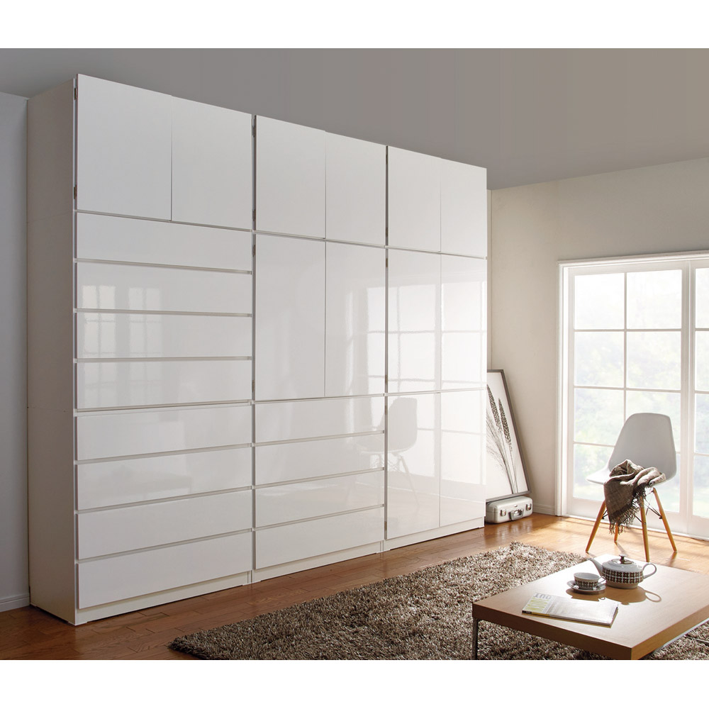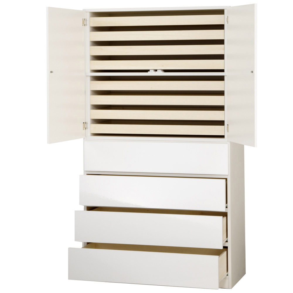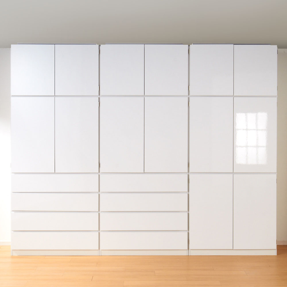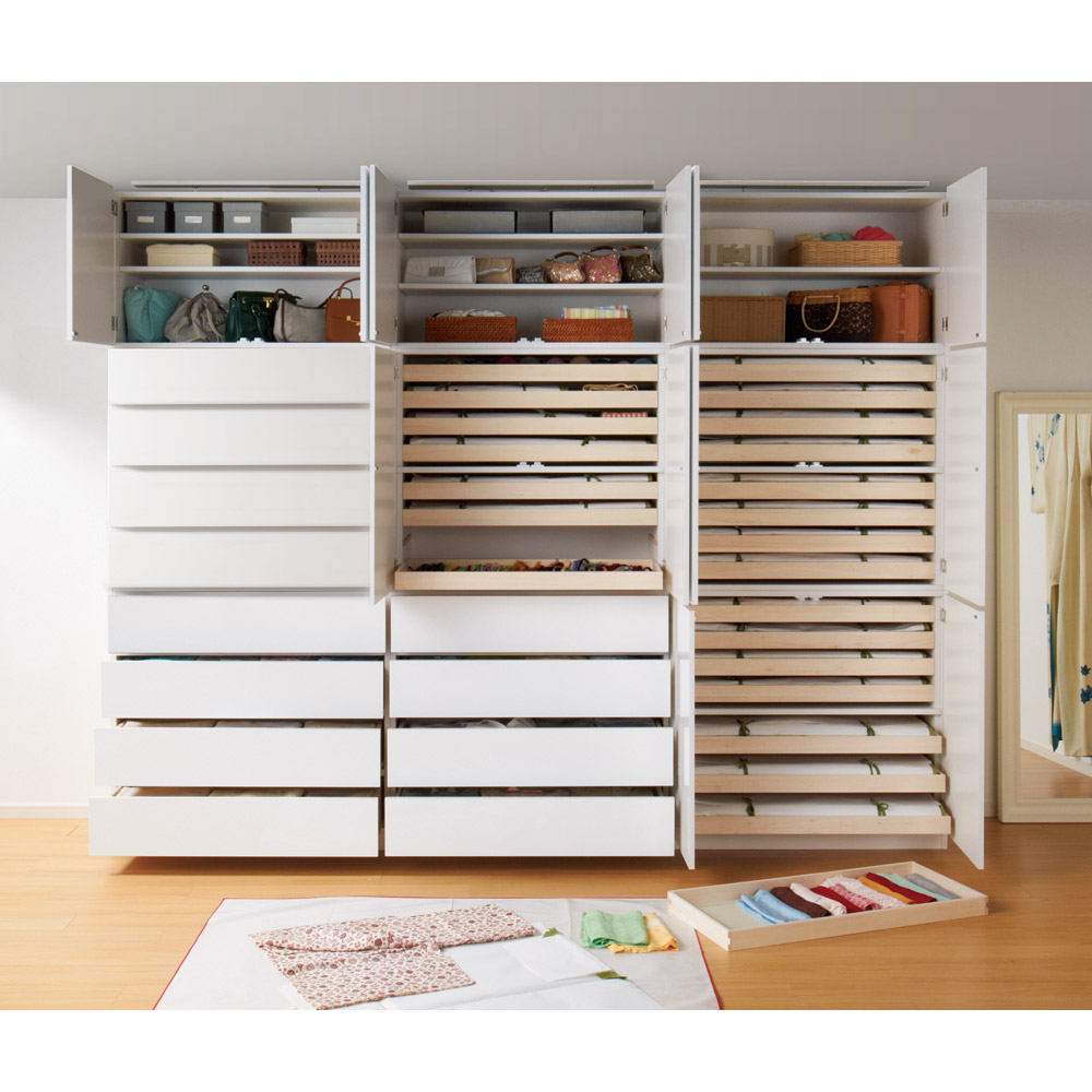 着物を整理するためのクローゼットを作り出す現代的着物収納スタイル。着物タンスの機能を備え、かつモダンなデザイン。別売りの上置きの併用で、天井までぴったりの着物もしまえる美しい壁面収納クローゼットに。着物が大好きでたくさん持っているんだけど、和室がないから和風のタンスは置きたくない。洋室やクローゼットに違和感なく大切にキモノをしまっておきたい。そんな方におすすめする衣類収納家具です。洋服と着物を一緒にシンプルで美しいモダンな収納スペースにひとまとめすれば、すっきりと片付いた印象のクローゼットを作れます。■現代の着物美人にささげる新しいモダンデザインの収納システム着物をたとう紙に包んだ状態で収納できる盆収納、着物はもちろん和装小物類も収納できる引き出しと棚収納。お部屋の壁面やウォークインクローゼットのハンガー下などの設置予定場所に合わせて、またお持ちの和服や小物の量に応じてお選びください。■盆収納は内寸90cm!!幅90cmまでのたとう紙(きもの文庫)に対応した内寸サイズ。着物をたとう紙に包んだ状態で、折らずに収納できます。■光沢が美しい前板ですっきり!前板には光沢感があり、キズや汚れにも強いシートを使用。■別売りの上置きで天井にぴったり!突っ張り式オーダー上置き(別売り)を組み合わせれば、天井までいっぱいを収納空間に変えられます。ご自宅の天井高さに合わせてお作りしますので安定感も出て安心です。こちらは「上盆収納&下引き出し・幅100cmタイプ」です。◎上部は盆収納(8杯)、下部は引き出し(4杯)で盆には着物、引き出しには和装小物や襦袢、Tシャツやジーンズなどの洋服を収納してもOK!◎下部の引き出し収納は全段ストッパー付きスライドレールを装備しているため、開閉がらくらくです。◎上下に分けてお届けしますので、ご自宅の設置予定場所への搬入もスムーズです。