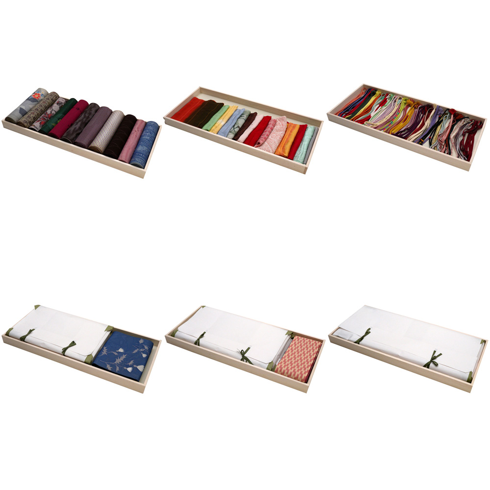 [写真上]反物、帯揚げなどを盆に収納する場合の例。[写真下]たとう紙を盆に収納する場合の例。