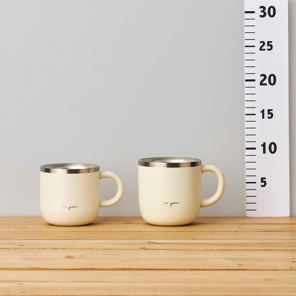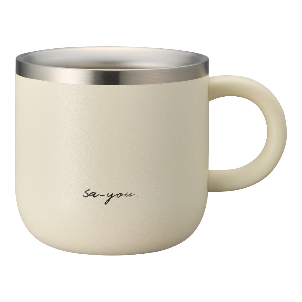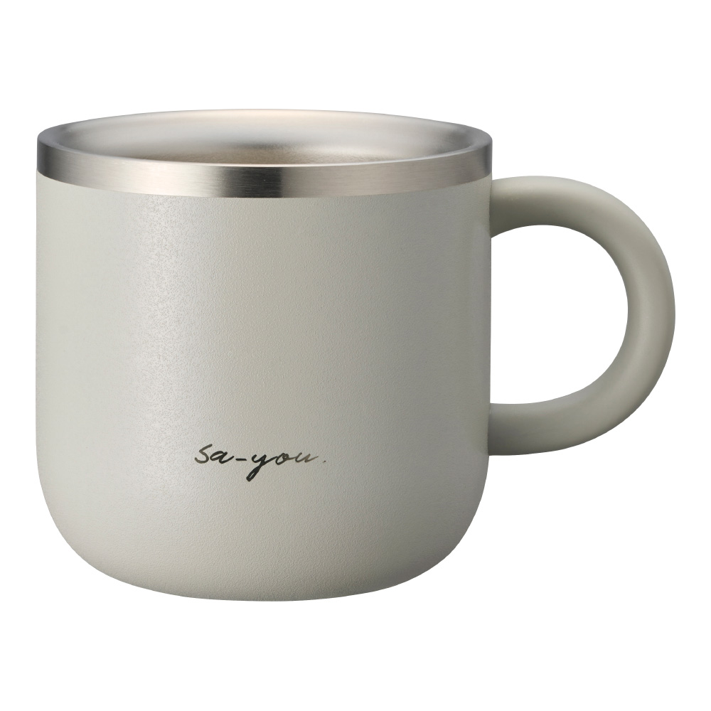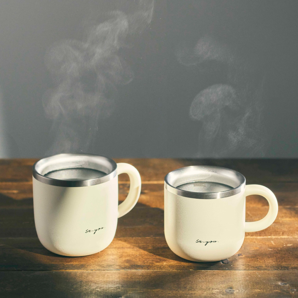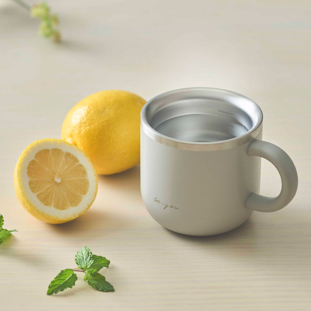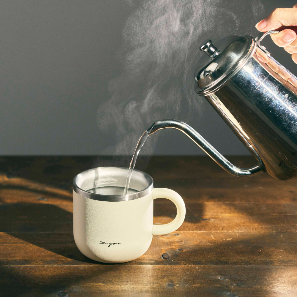 95℃の熱湯が3分で白湯に適した60〜65℃に!従来品よりコンパクトで早く冷めるクイックタイプ♪朝の忙しい時間に、熱湯を白湯に適した温度に下げる白湯専用マグカップ本体内側と外側に断熱効果の高いステンレスを使用し、そのステンレス2枚の間に、吸熱剤をいれることで熱湯を飲みやすい温度に下げることができるマグカップ。保温のための蓋をなくし、熱を遮断する真空構造もなくすことで、温度をより下がりやすいようにしました。外側にじんわりと温度も伝わるので、寒い時期には陶器製のマグカップのように手を温めることもできます。約3分で熱湯を飲みやすい温度に下げて温かさ長持ち熱湯を注ぐだけで吸熱剤が、熱を吸収してくれ約3分で飲みやすい64℃にします。吸熱剤が一定の温度まで下げた後は、吸熱剤自体の熱と、蓄熱性の高いステンレスのおかげで、徐々に本体外側に熱を逃がしながら、飲みやすい温度を1時間程度保つことができます。一般的なステンレス真空2重構造のマグカップだと3分で86℃、陶器製のマグカップでも79℃とすぐに飲むには熱い温度です。本製品は朝に使用いただくことを想定しています。忙しい朝でもさっと温度を下げることで、手軽に温活を続けることが可能です。普段使いしやすいシンプルなデザイン丸みのある形状と、優しい色合いにすることで普段使いしやすいデザインに。中には白湯を目切りできる水位線付きで、使いやすさも◎。また、本体に印刷されている「sa-you.」のロゴには、「あなたも白湯をはじめよう!」という温活を生活に取り入れて欲しい気持ちからデザインされています。白湯とは?白湯とは一度沸騰させ飲みやすい温度にまで下げたお湯のことを言い、一度沸騰させることで、不純物やカルキが取り除かれ飲みやすくなります。2022年に行われた調査では、白湯の飲用頻度は男性で54.4%、女性67.5%(※1)となっています。中でも、普段白湯を飲む女性の51.2%(※2)は朝起きた時に飲むことがわかっています。陶器製マグカップやステンレス真空二重構造のマグカップを使うと沸騰した湯を適温にさげるのに10分以上必要ですが、このマグカップなら約3分で白湯が完成します。朝の忙しい時間に白湯を飲む時間を持つことが難しい方にこそ試していただきたい商品です。(※1・2)マーケティング・リサーチ会社のクロス・マーケティングが実施した調査による。従来品よりコンパクトで早く冷めるクイックタイプ♪白湯は1回につき150〜200mlをこまめに飲むのが良いとされているのでより白湯に特化した仕様になりました。