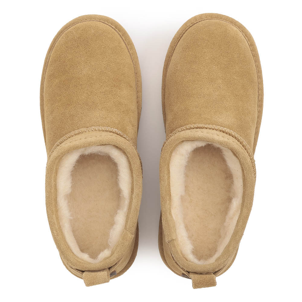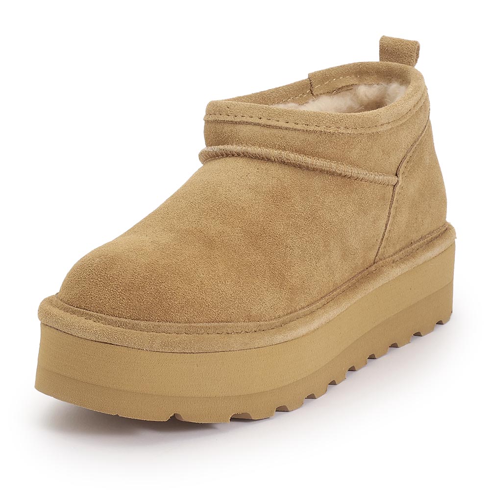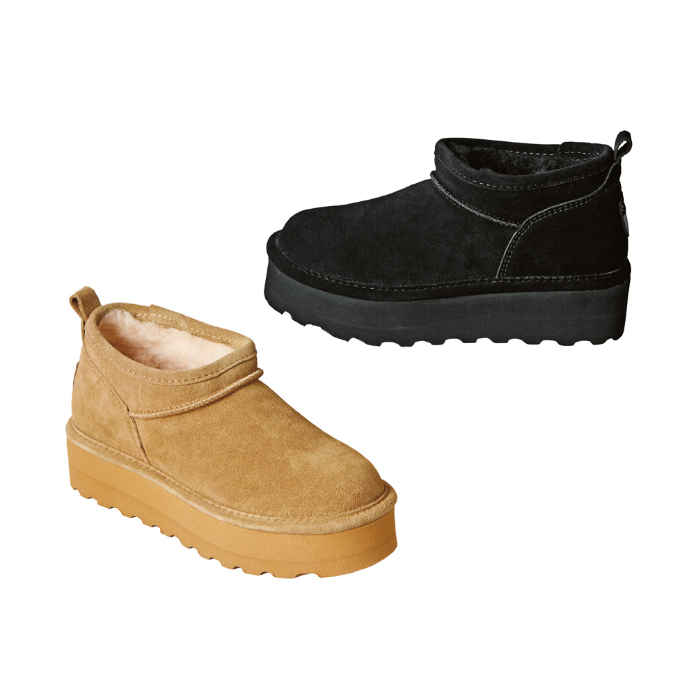 厚底ムートンブーツはトレンドのショート丈でスタイルアップを実現。オリジナルのスプレーコーティング加工をほどこし、はっ水性があるため急な雨や雪でも安心。内側全体はボアが配置されているので防寒に優れ、真冬も活躍。コーディネートに合わせやすいブラックとキャメルをご用意。