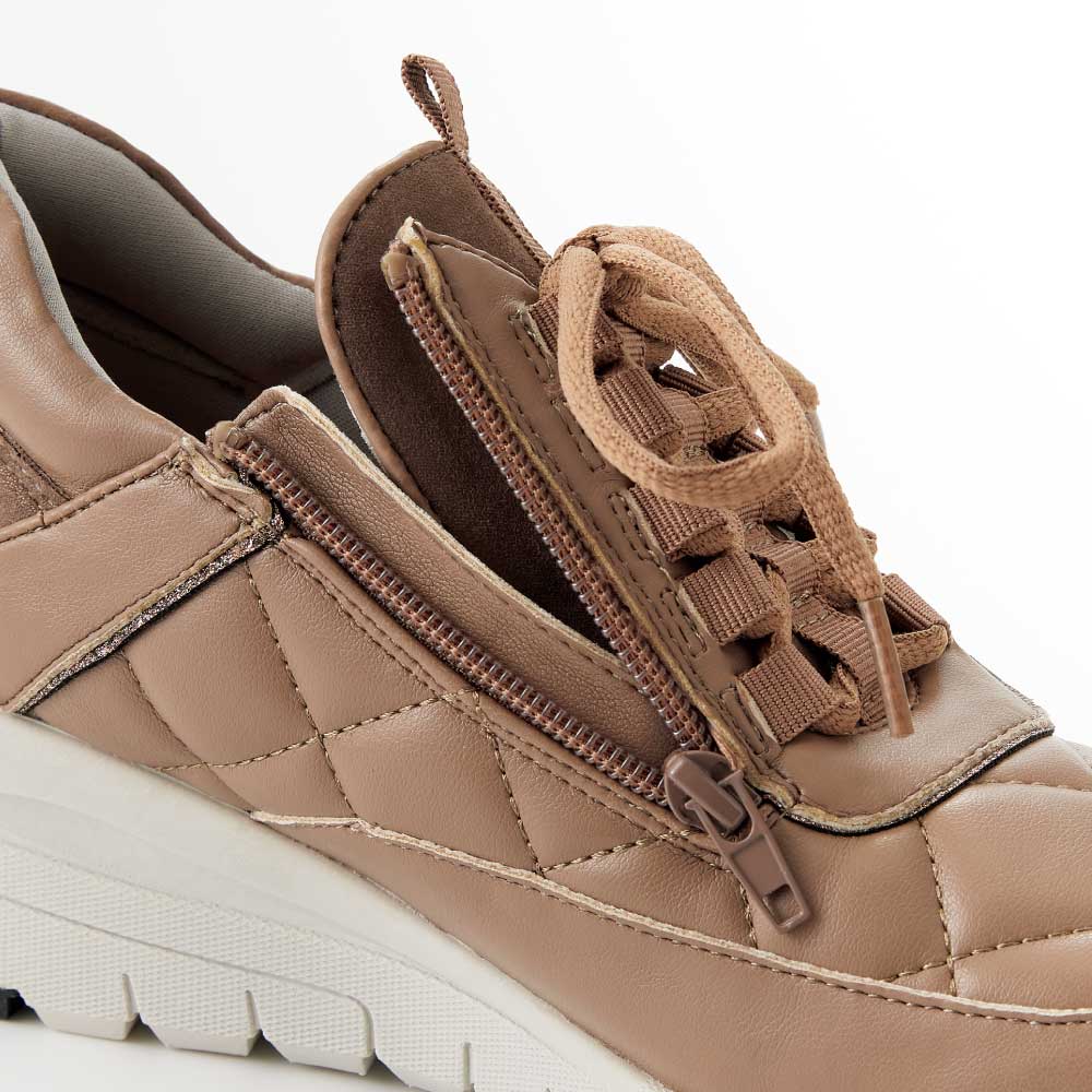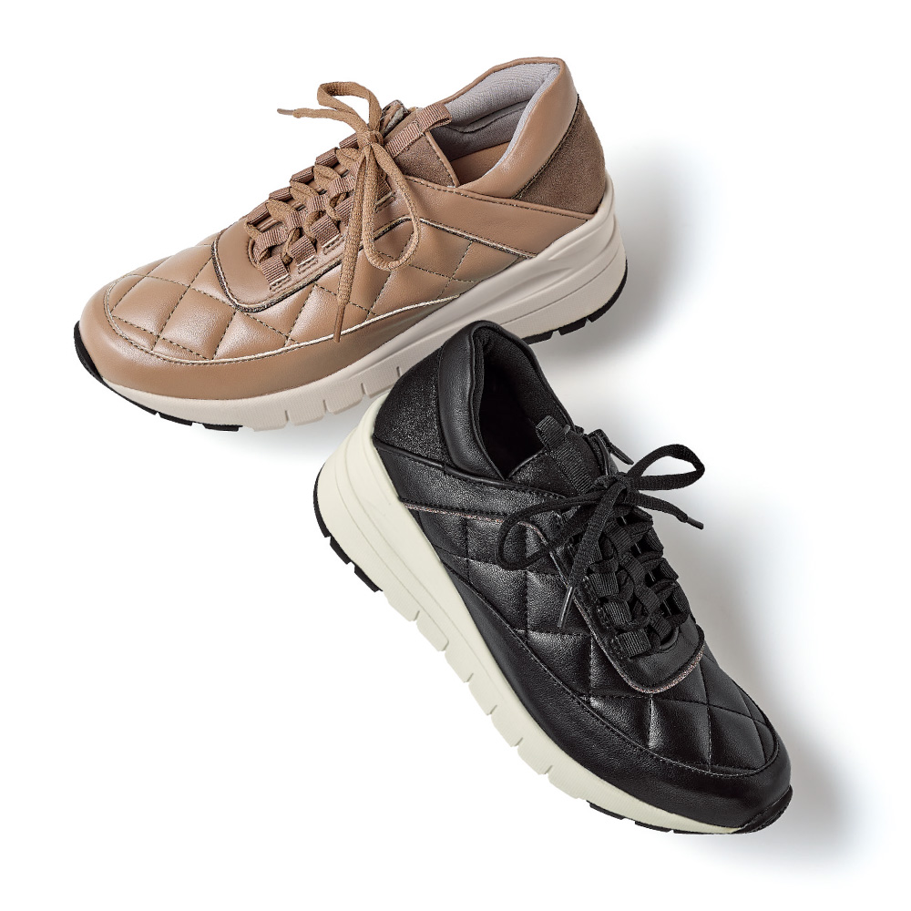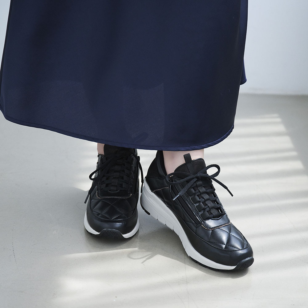 ウェッジソールで楽にスタイルアップ。キルティングが上品なスニーカーやわらかで軽いはっ水素材を使ったウェッジソールの新作スニーカーです。キルティング加工と細く入ったラメのラインがおしゃれな新作は内側ファスナー付きで着脱も簡単。履き口は足当たりもやわらかい、ふかふか仕様に。