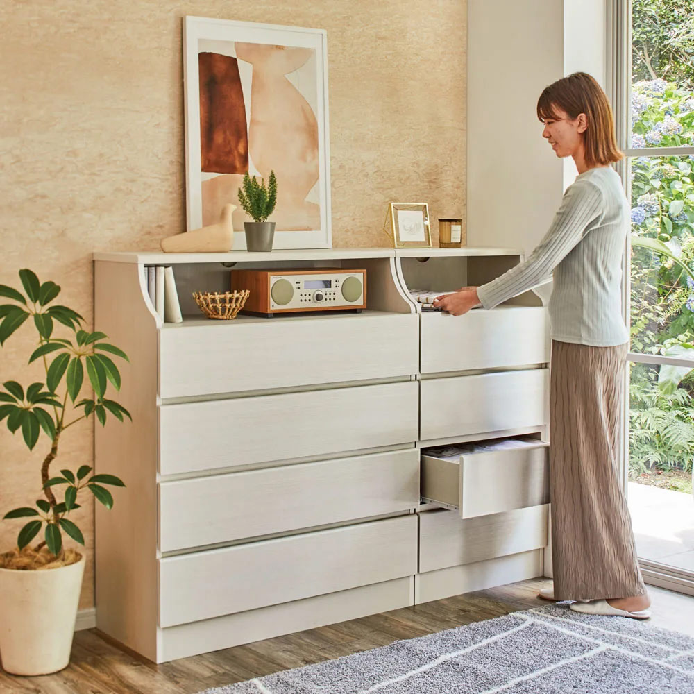 (ア)ホワイト木目 天板下のオープン棚は、洋服をたたむ作業などにも使える空間。たたんだ服をそのまま引き出しにしまえて便利です。 ※写真は(左)4段・幅90cmタイプ、(右)4段・幅60cmタイプです。