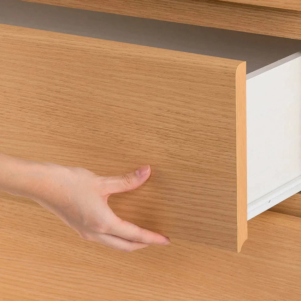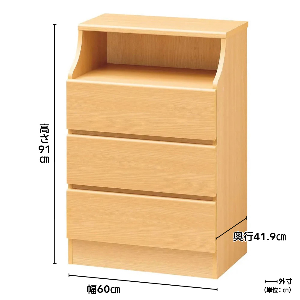 探していた「ぴったりサイズ」が見つかる!お部屋に合わせてクローゼット収納として、子供部屋やリビング収納として選べる衣類収納家具。収納を増やしたい場所のスペースや雰囲気に合わせて自由に選べるタンスです。いろんなシーンで使える、サイズ豊富なチェストホワイト木目 左:3段・幅44cmタイプ、右:3段・幅60cmタイプ収納を増やしたい場所のスペースや雰囲気に合わせて、自由に選べるタンスです。リビング、寝室、子供部屋、プライベートルーム、クローゼットやウォークインクローゼットの内部など様々な場所で活躍。廊下やソファサイドなどで電話台、小型TV台としても使えます。チェスト3段タイプ(高さ91cm幅60cm)お届け商品 (単位:cm)幅は44cm・60cm・90cmの3種類、高さは3段(91cm)、4段(112cm)の2種類、計6種類のサイズをご用意。インテリアに馴染む3色左からホワイト木目3段・幅44cm、4段ナチュラル4段・幅90cm、ダークブラウン4段・幅60cmホワイト(木目)・ナチュラル・ダークブラウンの3色をご用意。壁や床、扉の色に合わせたり、他の家具とコーディネートすることで、お部屋に統一感と調和をもたらします。ちょっとした作業にも使えるオープンホワイト(木目)左:4段・幅90cmタイプ、右:4段・幅60cmタイプ天板下のオープン棚は、洋服をたたむ作業などにも使える空間。たたんだ服をそのまま引き出しにしまえて便利です。見せる収納と使いやすさを両立ダークブラウン 左:4段・幅60cmタイプ、右:4段・幅90cmタイプ天板上は、観葉植物やインテリアを置く飾り棚として使えます。出し入れしやすいオープン棚はよく使う物の置き場に。開閉スムーズな引き出し引き出しはストッパー付きスライドレールで開閉がスムーズ。手を掛けて引き出す、スッキリデザイン。家電も置ける、背面にコード穴付きオープン部背面にコード穴付き。オープン部は背面からコードが通せるので充電器や生活家電も置けます。 ※オープン部の内寸奥行は37.6cm 天板のせり出しによって背面に隙間が確保されているため、コードを通しても壁に寄せて設置できます。さらに幅木があっても壁にぴったり寄せることが可能です。サニタリー収納を増やしたいときにナチュラル 3段・幅44cmタイプ洗面所で使うアイテムをまとめて収納。ちょっとした作業台になるのも嬉しいポイントです。ベッドサイドの小物置き場にナチュラル 4段・幅44cmタイププロジェクター台にして寝室で動画観賞も。お手頃価格の理由は「簡単組み立て式」ホワイト(木目)左:4段・幅90cmタイプ、右:4段・幅60cmタイプ価格をおさえるため、組立式を採用。簡単組立なので、力の必要なダボの取り付けや、面倒なスライドレールの取り付けは済んだ状態でお届けします。組立時間を少しでも短縮できる工夫を取り入れているので、比較的簡単に組み立てられます。