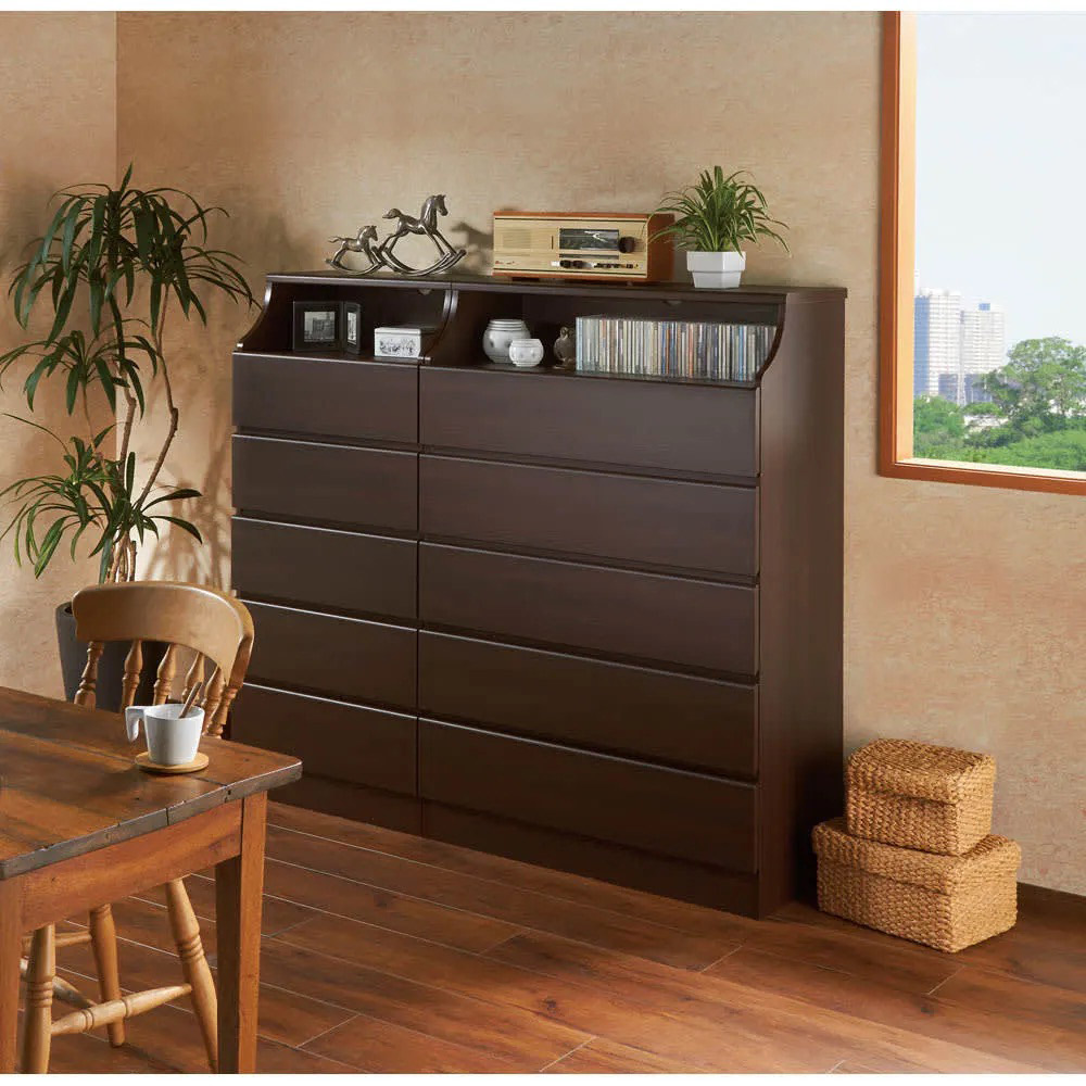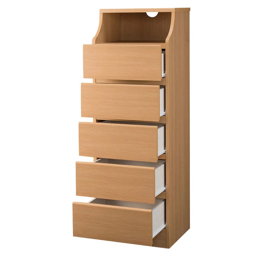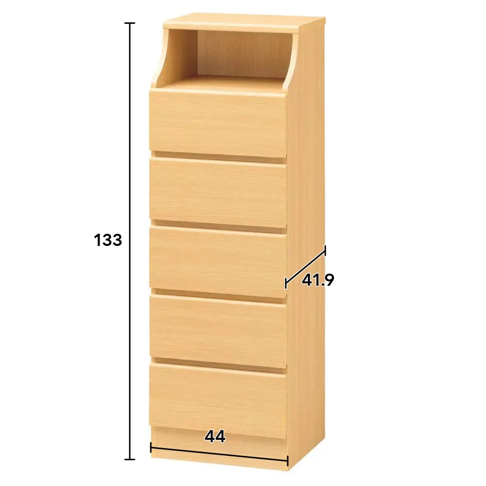 探していた「ぴったりサイズ」が見つかる!お部屋に合わせてクローゼット収納として、子供部屋やリビング収納として選べる衣類収納家具。収納を増やしたい場所のスペースや雰囲気に合わせて自由に選べるタンスです。ダークブラウン 左:5段・幅60cmタイプ、右:5段・幅90cmタイプいろんなシーンで使える、サイズ豊富なチェスト収納を増やしたい場所のスペースや雰囲気に合わせて、自由に選べるタンスです。リビング、寝室、子供部屋、プライベートルーム、クローゼットやウォークインクローゼットの内部など様々な場所で活躍。廊下やソファサイドなどで電話台、小型TV台としても使えます。お届け商品 (単位:cm)チェスト5段タイプ(高さ133cm幅44cm)幅は44cm・60cm・90cmの3種類、高さは3段(91cm)、4段(112cm)、5段(133cm)の3種類、計9種類のサイズをご用意。左からホワイト木目3段・幅44cm、4段ナチュラル4段・幅90cm、ダークブラウン5段・幅60cmインテリアに馴染む3色ホワイト(木目)・ナチュラル・ダークブラウンの3色をご用意。壁や床、扉の色に合わせたり、他の家具とコーディネートすることで、お部屋に統一感と調和をもたらします。ホワイト(木目)左:4段・幅90cmタイプ、右:4段・幅60cmタイプちょっとした作業にも使えるオープン棚天板下のオープン棚は、洋服をたたむ作業などにも使える空間。たたんだ服をそのまま引き出しにしまえて便利です。 ホワイト(木目)左:4段・幅90cmタイプ、右:4段・幅60cmタイプ見せる収納と使いやすさを両立天板上は、観葉植物やインテリアを置く飾り棚として使えます。出し入れしやすいオープン棚はよく使う物の置き場に。 開閉スムーズな引き出し引き出しはストッパー付きスライドレールで開閉がスムーズ。手を掛けて引き出す、スッキリデザイン。家電も置ける、背面にコード穴付きオープン部背面にコード穴付き。オープン部は背面からコードが通せるので充電器や生活家電も置けます。 ※オープン部の内寸奥行は37.6cm 天板のせり出しによって背面に隙間が確保されているため、コードを通しても壁に寄せて設置できます。さらに幅木があっても壁にぴったり寄せることが可能です。ナチュラル 3段・幅44cmタイプサニタリー収納を増やしたいときに洗面所で使うアイテムをまとめて収納。ちょっとした作業台になるのも嬉しいポイントです。ナチュラル 4段・幅44cmタイプベッドサイドの小物置き場にプロジェクター台にして寝室で動画観賞も。ホワイト木目 左:3段・幅44cmタイプ、右:3段・幅60cmタイプお手頃価格の理由は「簡単組み立て式」価格をおさえるため、組立式を採用。簡単組立なので、力の必要なダボの取り付けや、面倒なスライドレールの取り付けは済んだ状態でお届けします。組立時間を少しでも短縮できる工夫を取り入れているので、比較的簡単に組み立てられます。