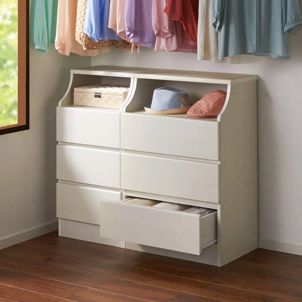 (ア)ホワイト木目 天板下のオープン棚は、洋服をたたむ作業などにも使える空間。たたんだ服をそのまま引き出しにしまえて便利です。 ※写真は(左)4段・幅90cmタイプ、(右)4段・幅60cmタイプです。