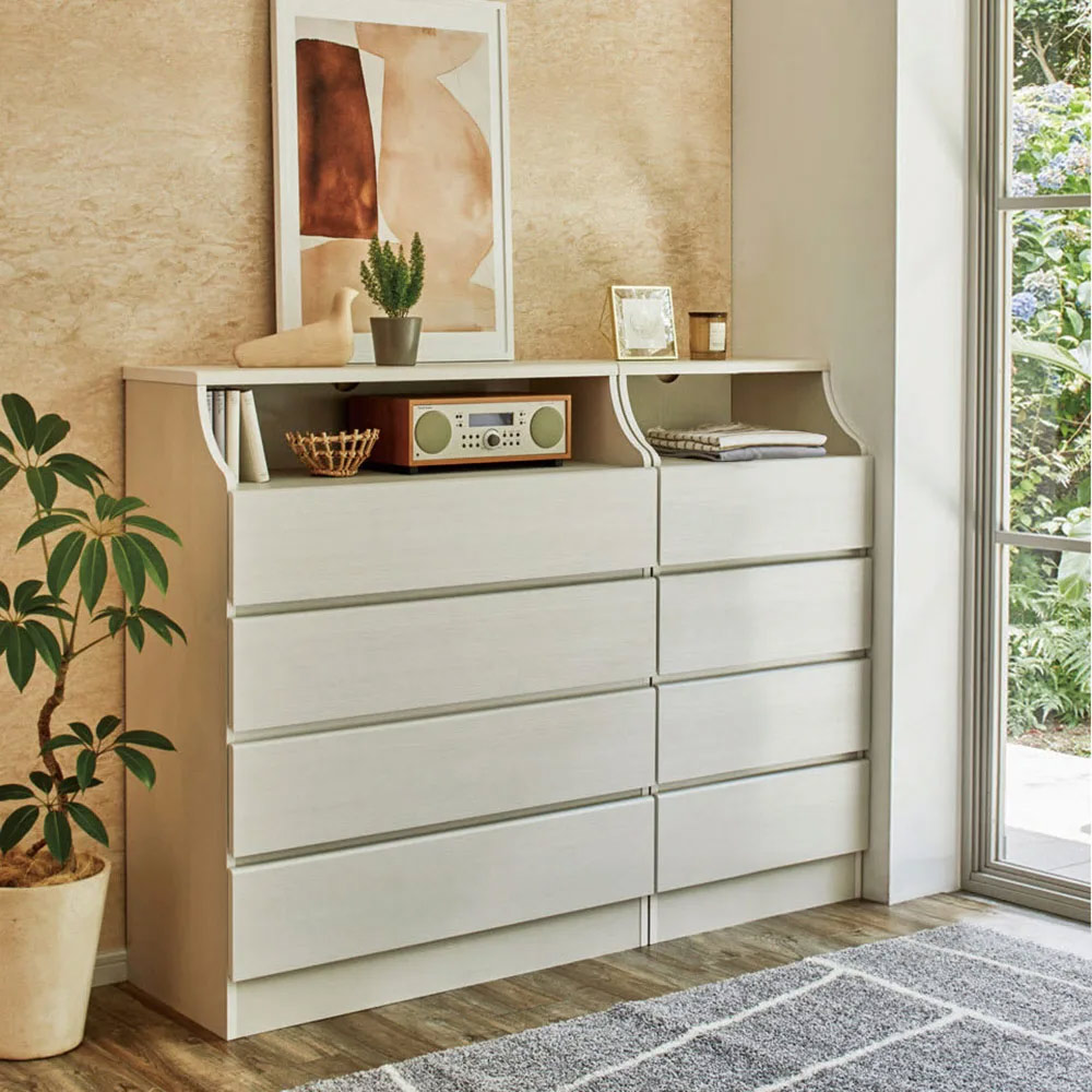 (ア)ホワイト木目 天板下のオープン棚は、洋服をたたむ作業などにも使える空間。たたんだ服をそのまま引き出しにしまえて便利です。 ※写真は(左)4段・幅90cmタイプ、(右)4段・幅60cmタイプです。