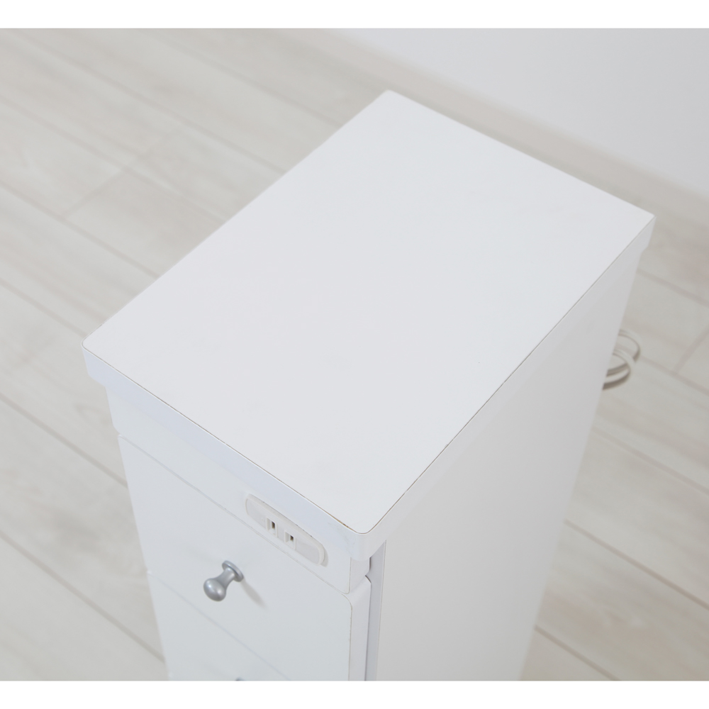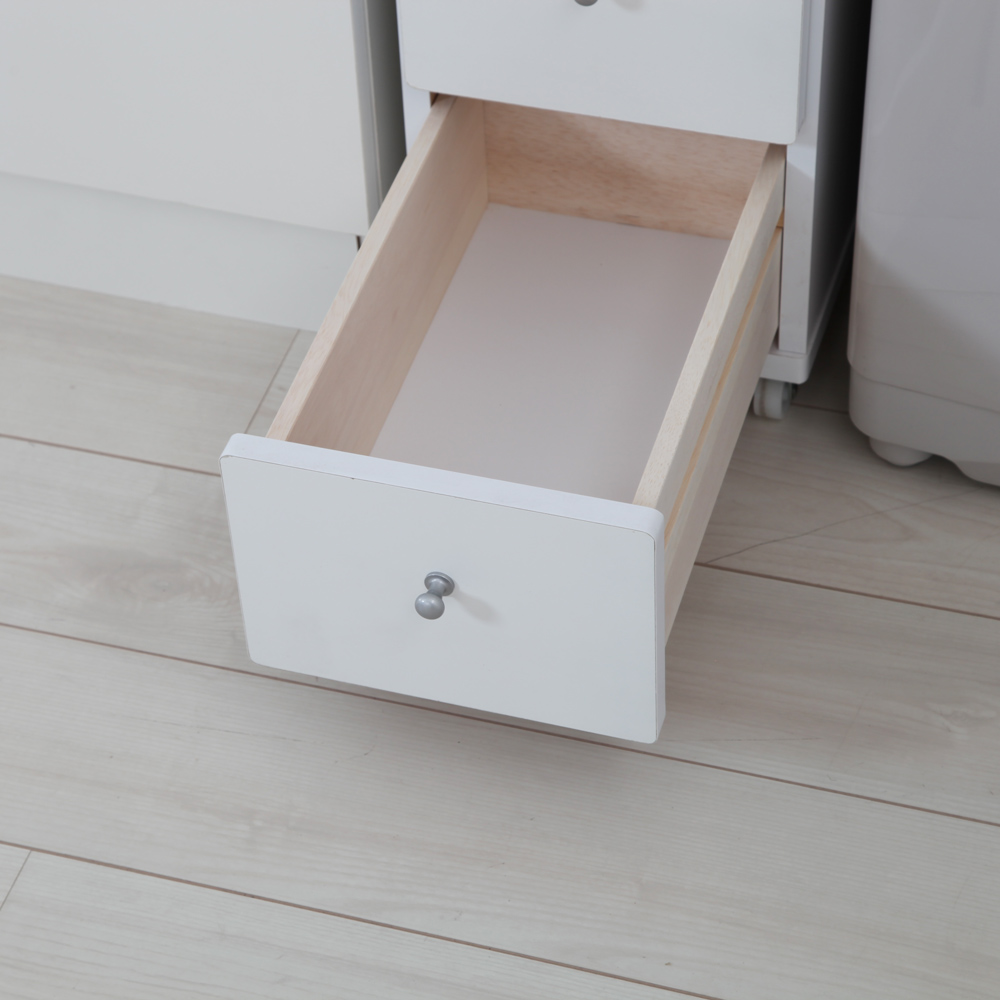 洗面所のわずかなすき間が収納スペースに変身するスリムチェスト。前面にコンセントがあり、身支度や充電がその場で!移動もラクなキャスター付きです。幅15cm〜30cmのすき間が活きるサニタリー収納●洗面室やランドリーのちょっとしたすき間に収まる薄型チェストです。●サイズが豊富で無駄な空間をつくらないため、スペースが有効活用できます。●幅は15cm、20cm、25cm、30cmの4サイズ。5cm刻みだから、うちにぴったり!が探せます。●奥行は29cmと44cmをご用意。洗面台や洗濯機の奥行に合わせて選べます。●高さは80cm。洗面台横の延長スペースとしても使えて便利です。●天板と前面は、汚れがサッと拭き取れるポリエステル化粧合板。●洗面台の水がハネても安心の素材で、お手入れも簡単です。●4杯の引き出しにタオルや着替え、洗剤のストックなどが仕分け収納できます。●洗面所収納にぴったりの清潔感のあるホワイト色です。すき間家具でも妥協なし!のこだわり設計【1】身支度に重宝なコンセント付き●前板に1口コンセント付きだから、ドライヤーやヘアアイロン、美容家電がその場で使えます。●電動歯ブラシやシェーバーの使用や充電にも便利。●洗面台横で身支度やメイクする際に、近くにコンセントがあるととても重宝します。【2】キャスター付きでお掃除がラク●キャスター付きでお掃除の際の移動がスムーズです。●髪の毛やホコリが溜まりやすいチェスト裏を常にきれいに保てます。●細かい物を落としてもサッと取り出せるから、「すき間に落ちた物が取れない」ストレスも解消!【3】引き出しの落下を防ぐストッパー付き●引き出し全段に抜け落ち防止のストッパー付き。●抜け落ちで中身が散乱する惨事も回避でき、お子さまがいるご家庭でも安心です。●丈夫で丁寧なつくりの日本製です。●洗面所のリフォームや引っ越しのタイミングにご検討ください。●組み立て不要の完成品でお届けします。お客さまにて取っ手の取付のみお願いいたします。●幅違い、奥行違いもご用意。シリーズ商品のご案内幅と奥行が豊富に選べるキャスター付きすき間チェストは以下のシリーズ商品がございます。・奥行29cm幅15cm・奥行29cm幅20cm・奥行29cm幅20cm・奥行29cm幅30cm・奥行44cm幅15cm・奥行44cm幅20cm・奥行44cm幅25cm・奥行44cm幅30cm