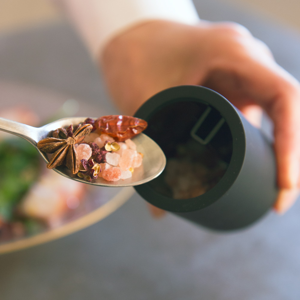 「複数のスパイスもまとめて挽けるから、それだけで味が決まるオリジナルのミックススパイス作りも楽しめます。」