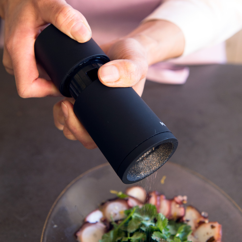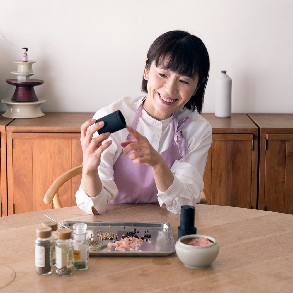 ワタナベマキさんの手放せない道具塩・胡椒はもちろん、シナモンやナツメグも丸ごと挽けるミル。流行りのミックススパイス作りが楽しめます。スパイスを取り入れることで、日々の料理をもっと美味しく楽しく!スパイスはいつもの料理をワンランク美味しくしたり、料理の幅をぐんと広げてくれます。身体を温める、気分を上げる、食欲を増進するといったうれしい作用も。この手動ミルは硬いスパイスや大粒のスパイスも軽い力で挽けて、スパイス使いがとっても楽しくなりますよ。オリジナルのミックススパイスが作れる!塩分の調整も切れ味の鋭いこのミルは岩塩など複数のスパイスをまとめて挽くこともできます。オリジナルのミックススパイスを楽しんでみませんか。スパッと切れる刃で香りが立つ挽いているそばからいい香り!すり潰すのではなく、鋭い刃で切るように挽くから仕上がりの美味しさにもつながります。ピリッと爽やかで夏にぴったりの「アジアンミックス」ワタナベマキさんのオリジナルブレンド「アジアンミックス(花椒・八角・赤唐辛子・シナモン・塩)」を使ったタコのカルパッチョ。魚介の生臭みを消してくれるから、お刺身やあさりの酒蒸にもおすすめ。焼き鳥や炒め物に使ってもいつもと違った味わいに。ピリッとした辛みと爽やかな風味が食欲をそそります。オリジナルのミックススパイスも楽しめます複数のスパイスをブレンドすることができるのもポイント。今回は特別にオリジナルブレンドをディノスのお客様にだけご紹介!エスニックな香りと辛味がポイントの「アジアンミックス」と、様々な料理に合わせられる「万能ミックス」、どちらも手に入りやすいスパイスを使っているので、ぜひお試しください!いつもの料理がパッと華やぐ、香り豊かな「万能ミックス」オリジナルブレンド「万能ミックス(クミン・コリアンダー・ブラックペッパー・塩・エルブドプロバンス)」は肉・魚・野菜に幅広くマッチ。エルブドプロバンスがなければローリエで代用も◎。私がよく使うスパイスのクミンを軸に、主張は強すぎないけれど料理にぐんと華やかさを添えてくれます。「万能ミックス」でシンプルに焼いただけのお肉や野菜がごちそうにじっくりローストしたレッドオニオンと紫にんじん、筋切りしてやわらかく焼き上げたポークソテー。どちらも味付けは「万能ミックス」だけ。野菜は甘さが引き立ちますし、お肉は臭みが消えて、スパイスとハーブの効果でさっぱりいただけますよ。作り慣れた料理も「万能ミックス」で新鮮な味わいに身近で簡単なお料理にこそ気軽にスパイスを使ってみてほしいです。目玉焼きも、ズッキーニ・パプリカ・じゃがいものソテーも、オリーブオイルで焼いて「万能ミックス」をかけるだけなので手間いらず。開口部が広く、スパイスを入れやすい。更にストックも!開口部が広いので大きめのスパイスも投入できるし、粒胡椒などをこぼさず入れることもできて、とても使い勝手が良いです。更に上部のふたを外すと、中にスパイスのストックを入れておけるスペースが。コンパクトながら無駄のないデザインです。すり潰すよりも力が要らず、なおかつスパイスの香りが際立つ秘密は、卸金のように細かく並んだ特殊な刃の形状にあります。