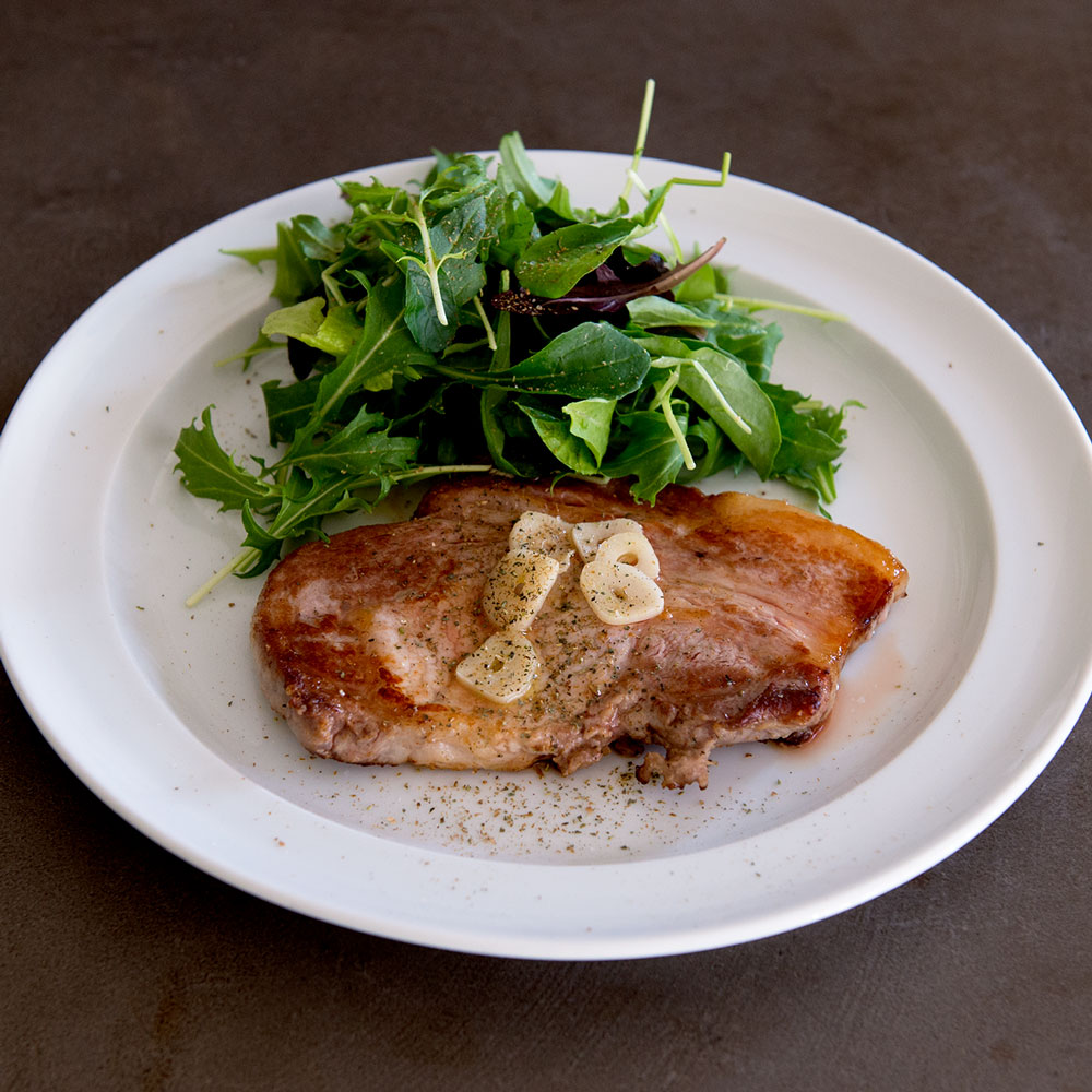 こんがり焼き上げたポークソテーに「万能ミックス」だけで味付け完了。ごはんにもワインにも合うごちそうに。