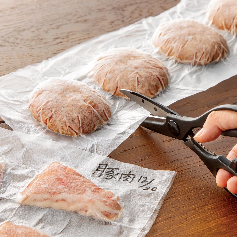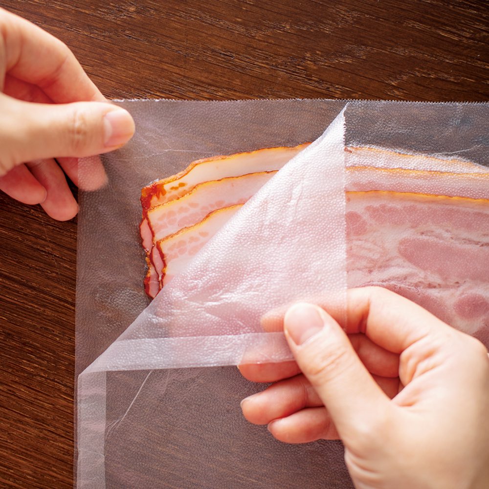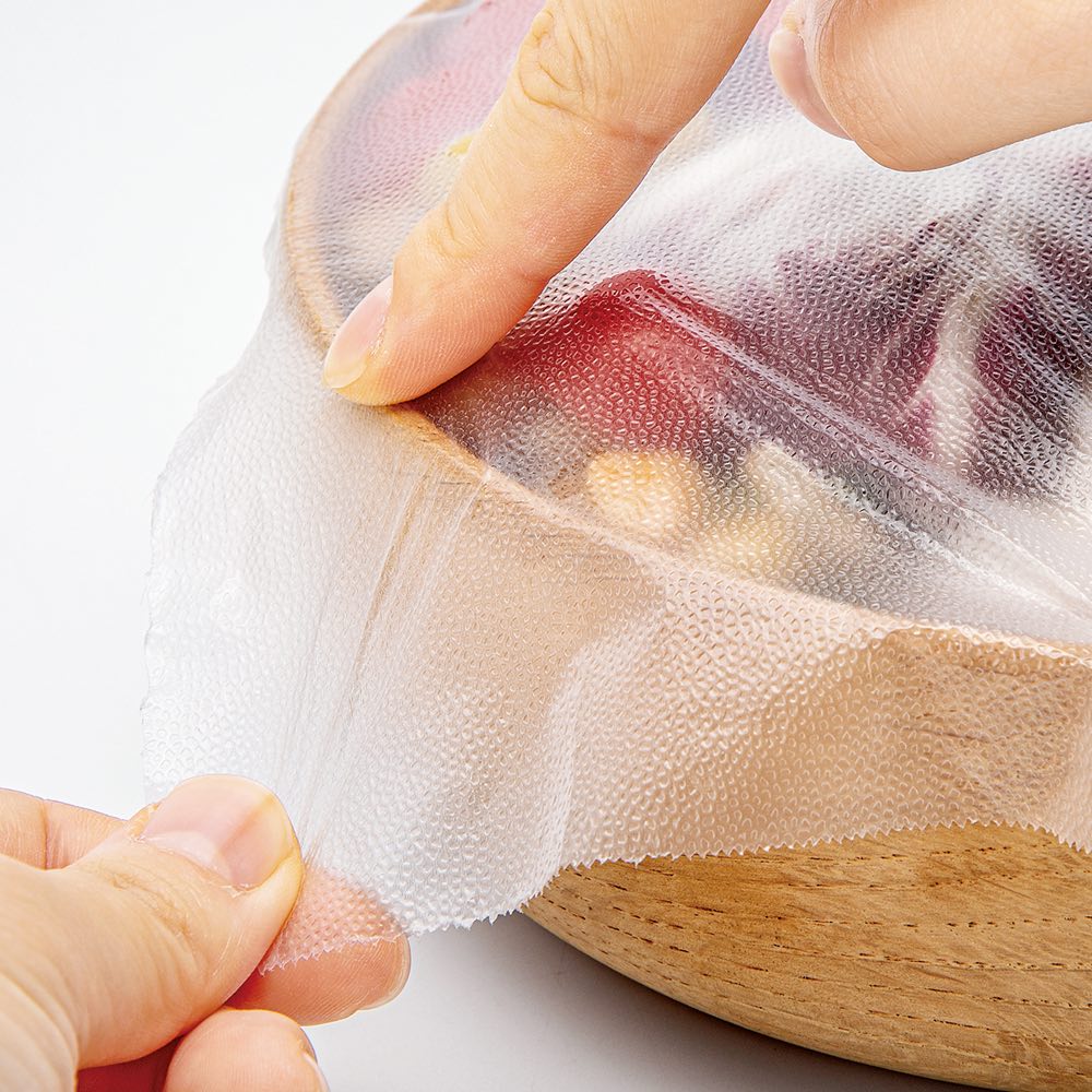 ピタッと食材を密封して、鮮度をキープ!繰り返し使えるので、とっても経済的です。食材をシートではさむだけ。独自の凹凸加工で、陶器や木にも密着。冷凍焼けやドリップ防止効果もあり、そのまま冷凍保存や電子レンジ解凍もできます。食材をシートではさむだけ。独自の凹凸加工で、陶器や木にも密着。冷凍焼けやドリップ防止効果もあり、そのまま冷凍保存や電子レンジ解凍もできます。●プレッスンシールラップは2枚重ねて押すだけで密封できます。●表面加工技術により幅広い材質に対して密着性を発揮。●密着力が落ちるまで繰り返し使用でき、とっても経済的。●肉や魚、野菜の保存に大活躍。●缶詰、ガラス器、プラスチック、陶器、ステンレス、木など、さまざまな素材に密着。●耐冷温度-30℃で、そのまま冷凍保存も。●耐熱100℃なので、電子レンジでの解凍もOK。【どんな素材でもラクラク密着!】●プレス&シールは、どんな素材にも抜群の密着力を発揮します。●トマト缶の残りもグラスに入ったジュースも、万一冷蔵庫で倒れてもこぼれずらいです。【食材の冷凍・小分けにも便利!】●「プレス&シール」は食材との密着性がバツグンです。●空気との接触が最小限に保たれることによって冷蔵・冷凍した食品の鮮度保持はもちろん、「冷凍焼け」(冷凍した食品の表面から水分が蒸発し脂肪が酸化、食品が変質・変色すること)も予防できます。●まとめ買いした肉を小分けにして冷凍、骨ばった魚の干物もスーッと軽くラップできます。使う分だけ取り出せるのも便利です。●食材保存の際はできるだけ空気を抜いてご使用ください。【ラップしにくい野菜の保存、料理の下ごしらえにも大活躍!】「プレス&シール」は、かさばる葉物野菜などのラップに最適です。冷蔵庫にコンパクトに収まり、みずみずしい鮮度を保ちます。また、野菜を丸ごと刻んでおいて小出しして使うなど、色々な使い方が広がります。〜〜使ってみました!!〜〜【ハムやベーコンに】一度に使いきれないスライスされたハムやベーコンの保存には、やはり非常に便利!ラップに包んで保存する場合は、周囲のベタベタが気になって毎回、ラップを交換しちゃうのですが、プレス&シールだとストレスなくきれいに剥がせて、中身が取り出しやすく、ふたたびピタッとなるので、ラップを無駄使いしている罪悪感もなく、とてもよかったです。【塊のチースにも】このためだけに買ってもいいと思ったのは、塊のチーズ。何種類かを少しずつ切って食べるのですが、プレス&シールだと形に沿って何度もピタッとなって見た目も美しいので、乾燥を嫌うチーズの保存には、非常に適していると、思います。◎魚の干物にも伊豆の実家からアジの干物がたくさん届いたので、プレス&シールで一枚一枚冷凍してみました。切り口が平らな切り身と比べると骨の凸凹がある分ややプレスしにくかったですが、ラップだと冷凍焼けしやすいので、経過観察が楽しみです。【使いかけのお豆腐に】毎回全部は使い切れないお豆腐はパックのまま保存できて、ラップのように取り出す際にうっかり水漏れすることもないので快適!数回に分けて食べる南蛮漬けや、マリネの保存にもいいのでは?(わが家のバット、フタがないのです)と、夢が広がります。ちょっと高くても、自分の暮らしにハマると、日々の快適さがぐんと上がり、もう元には戻れません(笑)