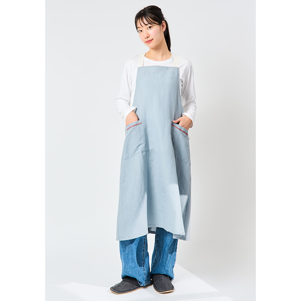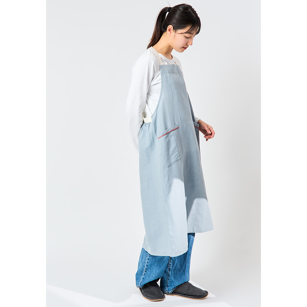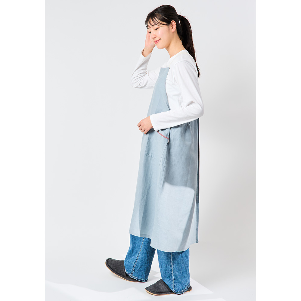 気分の上がる美しい色とソフトな肌触り。さっと、かぶるだけで準備OKで紐を結ぶ必要がありません。日常の中に贅沢を。遠州洗いの綿麻混素材が、大人の女性を華やかに演出します。遠州洗いの綿麻生地は幸せになる柔らかさです昔ながらの機械と手作業の加工で生地にソフトな風合いとシワを出した「遠州洗い」の生地を使ったエプロンです。繊維が柔らかく肌触りも優しくしわ感もお楽しみいただけます。柔らかな肌触りと高級感のある素材は、大人の女性を華やかに演出。シンプルで上品なデザインは、キッチンでの料理はもちろん、ホストとしてのおもてなしにもおすすめです。遠州洗いの技術を活かした、上質なエプロンをお探しの大人の女性にぴったりの商品です。遠州洗いとは?静岡県の浜松地区で丁寧に加工された生地を使用しています。人の手でカットした生地を、昔から使用している小さなワッシャー機に入れて加工します。少量ずつ揉み込むためキメの細やかなシワ感を出す事が可能になります。ワッシャー加工後、人の手で小さなタンブラー機に移して、ゆっくり乾燥させることで、独特の肌触りの良い柔らかい風合い仕上がります。※使用している小型のワッシャー機、タンブラー機とも手間が掛かるため、現在では使われる事が少なく、非常に珍しい機械です。大量生産できないため、限られた枚数しか作ることができず、その分価格も高くなってしまいますが、柔らかな生地を触っていただければその良さを感じていただけるのではないかと思います。長くご愛用頂ける素材です生地は麻60%綿40%。通気性と少しのシャリ感、柔らかさのある麻と綿の良いところをミックスした素材です。顔がぱっと明るくなる上品な色合いとポケットのステッチカラーがおしゃれです着るだけで元気が出そうな色合いを揃えました。どの色も麻混ならではの上品な発色で全部揃えてくなる美しさ!大人女性の顔色をぱっと明るくする厳選カラーです。各色ともポケットのステッチがアクセントでとても洒落ています。着る人の体系を選びません上からスポッとかぶるだけでボタンもひもも結ぶ必要がないので、忙しい時でもさっとすぐ着られます。贅沢に生地を使っているので、細身の方もぽっちゃり目の方もスッキリお召しいただけます。肩に負担の少ないフリークロスタイプ紐・ボタンがないのでスッキリしており、着用時のストレスがとても少ないです。お尻が隠れても背中が空いているので通気性もよいです。また紐が肩から落ちる・・・というストレスもありません。後ろ姿もかわいい!お尻も隠れますし、背中のクロスがとてもかわいい!気分があがります♪