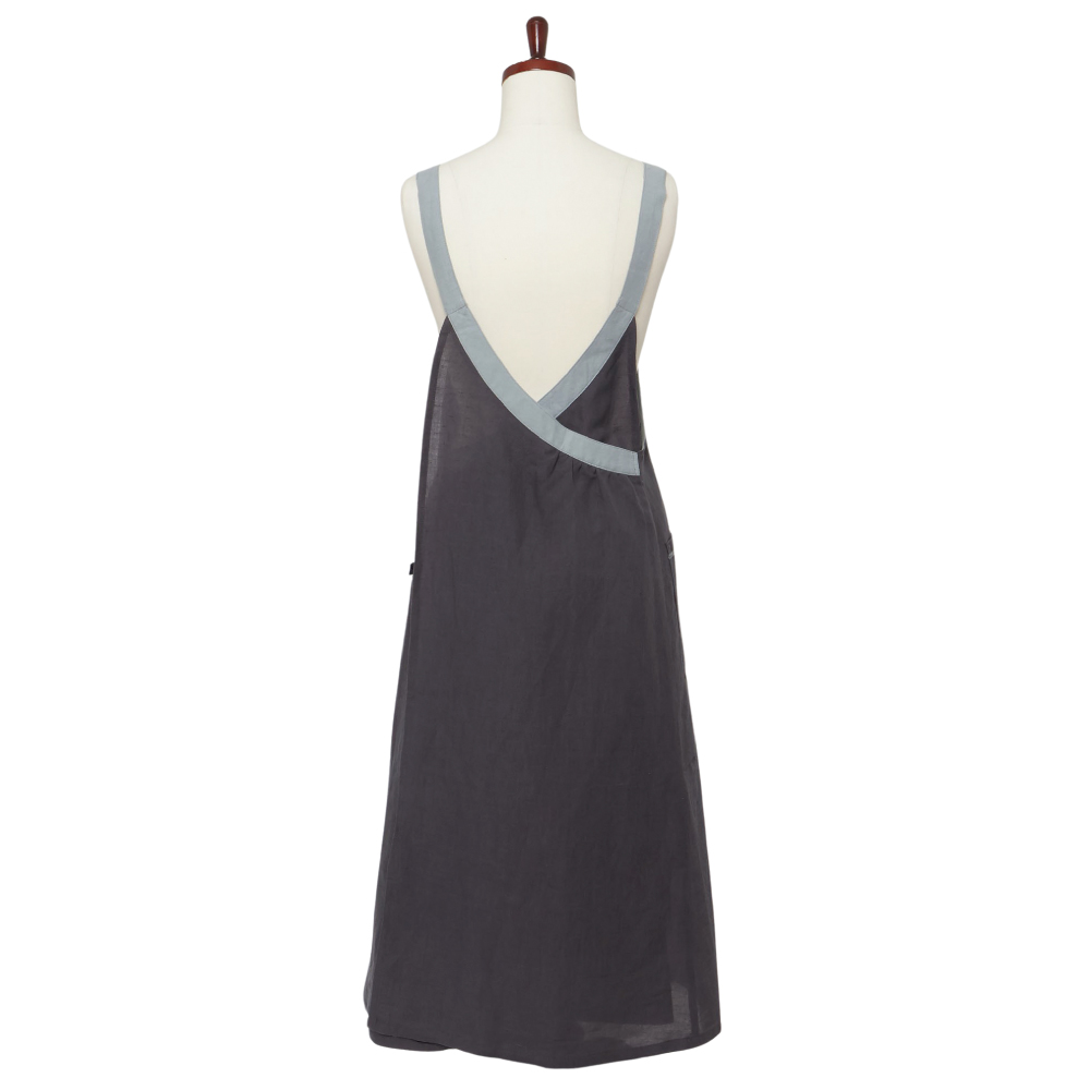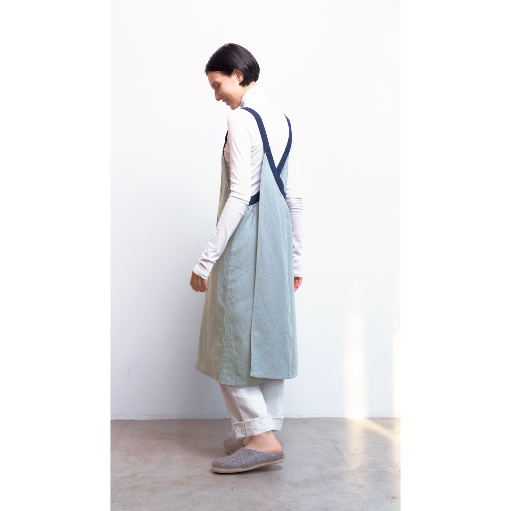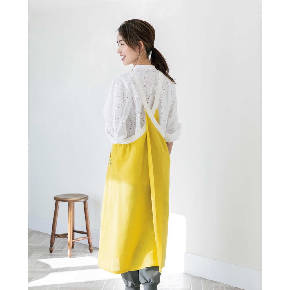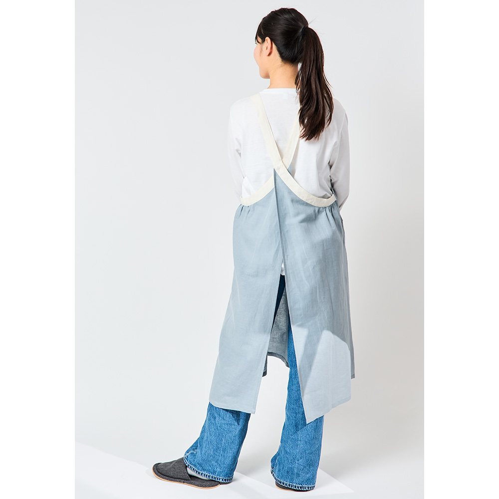 気分の上がる美しい色とソフトな肌触り。さっと、かぶるだけで準備OKで紐を結ぶ必要がありません。日常の中に贅沢を。遠州洗いの綿麻混素材が、大人の女性を華やかに演出します。遠州洗いの綿麻生地は幸せになる柔らかさです昔ながらの機械と手作業の加工で生地にソフトな風合いとシワを出した「遠州洗い」の生地を使ったエプロンです。繊維が柔らかく肌触りも優しくしわ感もお楽しみいただけます。柔らかな肌触りと高級感のある素材は、大人の女性を華やかに演出。シンプルで上品なデザインは、キッチンでの料理はもちろん、ホストとしてのおもてなしにもおすすめです。遠州洗いの技術を活かした、上質なエプロンをお探しの大人の女性にぴったりの商品です。遠州洗いとは?静岡県の浜松地区で丁寧に加工された生地を使用しています。人の手でカットした生地を、昔から使用している小さなワッシャー機に入れて加工します。少量ずつ揉み込むためキメの細やかなシワ感を出す事が可能になります。ワッシャー加工後、人の手で小さなタンブラー機に移して、ゆっくり乾燥させることで、独特の肌触りの良い柔らかい風合い仕上がります。※使用している小型のワッシャー機、タンブラー機とも手間が掛かるため、現在では使われる事が少なく、非常に珍しい機械です。大量生産できないため、限られた枚数しか作ることができず、その分価格も高くなってしまいますが、柔らかな生地を触っていただければその良さを感じていただけるのではないかと思います。長くご愛用頂ける素材です生地は麻60%綿40%。通気性と少しのシャリ感、柔らかさのある麻と綿の良いところをミックスした素材です。顔がぱっと明るくなる上品な色合いとポケットのステッチカラーがおしゃれです着るだけで元気が出そうな色合いを揃えました。どの色も麻混ならではの上品な発色で全部揃えてくなる美しさ!大人女性の顔色をぱっと明るくする厳選カラーです。各色ともポケットのステッチがアクセントでとても洒落ています。着る人の体系を選びません上からスポッとかぶるだけでボタンもひもも結ぶ必要がないので、忙しい時でもさっとすぐ着られます。贅沢に生地を使っているので、細身の方もぽっちゃり目の方もスッキリお召しいただけます。肩に負担の少ないフリークロスタイプ紐・ボタンがないのでスッキリしており、着用時のストレスがとても少ないです。お尻が隠れても背中が空いているので通気性もよいです。また紐が肩から落ちる・・・というストレスもありません。後ろ姿もかわいい!お尻も隠れますし、背中のクロスがとてもかわいい!気分があがります♪