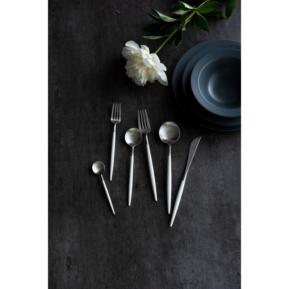 細い柄とゆるやかな曲線を描く美しいフォルムのGOA(ゴア)シリーズ。無駄のないシンプルでスタイリッシュなフォルムが魅力の、GOA(ゴア)シリーズ・テーブルスプーンです。洋食器から和食器まで、テーブルウェアを選ばずお使いいただけます。樹脂製の柄は軽くて手になじみやすく、使いやすいデザインです。ホワイトの柄とシルバーのデザインは食卓をエレガントに引き立てます。