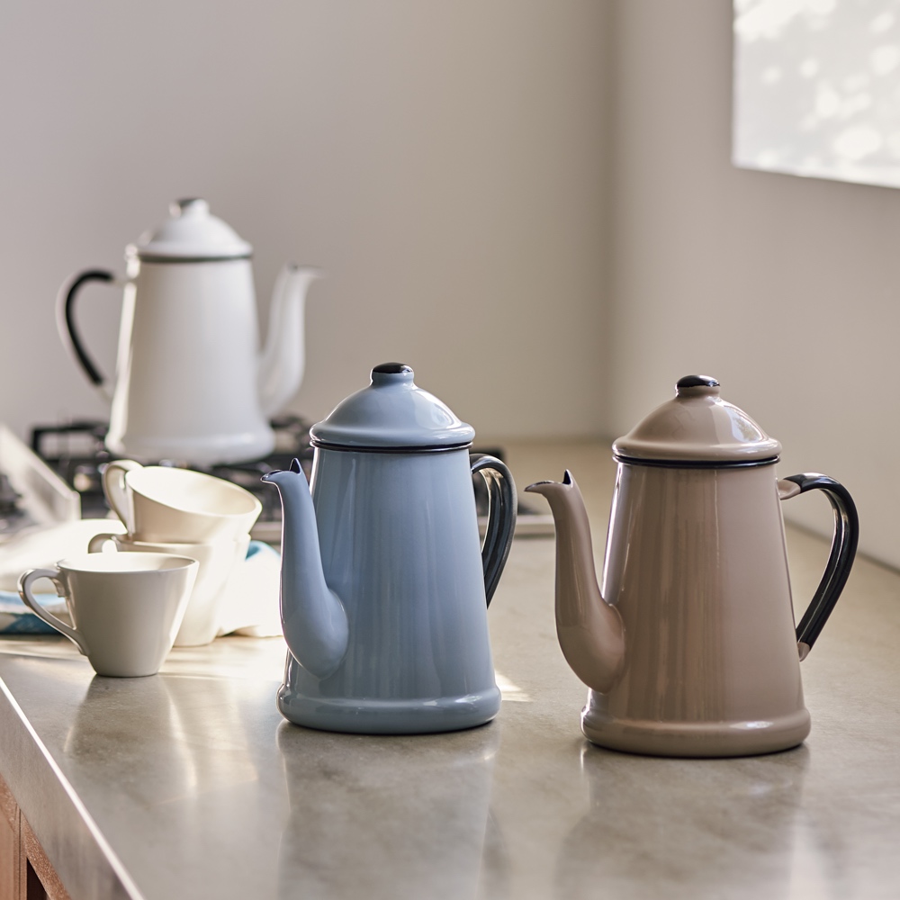 一滴ずつ丁寧に淹れたコーヒーで寛ぎのひと時。銀座の老舗カフェ向けに作られたポットのディノス限定カラーです国内で唯一、琺瑯づくりの全行程を自社で一貫生産している野田琺瑯が、1948年創業の銀座の名店「カフェ・ド・ランブル」から「お湯を1滴、2滴と置くように注げる湯口を」と依頼され作ったコーヒーポット。点滴のような繊細なコーヒードリップもたっぷり勢いよく注ぐこと自由自在ポイントはペリカンのくちばしに似た形状の注ぎ口。ポットの傾きを変えるだけで、点滴のようにポタポタとも、スーッと続けて注ぐことも、勢いよくドバッと注ぐことも可能。ガスでもIHでも使用可能直火はもちろん、IH電磁調理器にかけられ、コーヒーのドリップからやかんとしての使用まで対応する優秀ポットです。グレーとモカはディノスの企画色。スモーキーなニュアンス色がキッチンをおしゃれに彩ります。