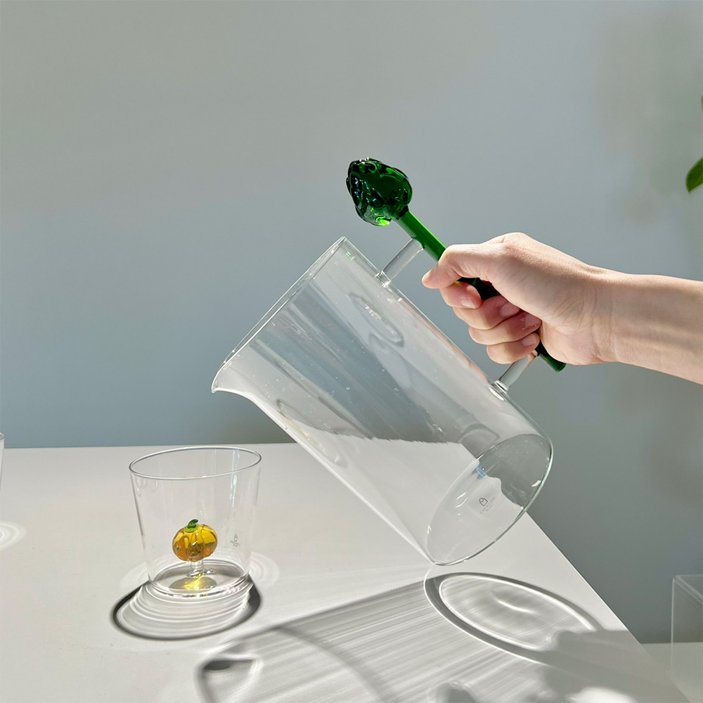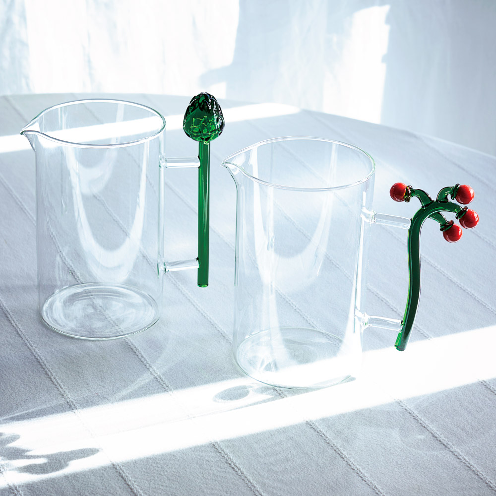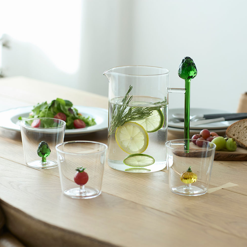 脱マンネリ・テーブルクロスで新スタイルに!生き生き感で運を呼び込むガラスのピッチャー。トマトやアーティチョークをモチーフにしたガラスピッチャー。植物の生命力を称えるデザインで、置いてあるだけで、テーブルに清涼感を演出します。注ぐたびに、計算されたフォルム美にうっとり。テーブルに清涼感をプラスするガラスピッチャー植物のフォルムをモチーフにしたユニークなガラスピッチャーは、食卓を爽やかに演出するアイテムです。アーティチョークやトマトのデザインは目を引きやすく、パーティーや来客時にも会話のきっかけとして活躍します。使いやすさとデザイン性を両立注ぐたびに手に馴染む取っ手と、安定感のあるフォルム。フォルム美と機能性を兼ね備えているので、普段使いにも最適です。アイスティーやフルーツウォーターなど冷たい飲み物はもちろん、透明感のあるガラスだから色とりどりのドリンクも美しく映えます。容量・素材について適正容量は1050ml。一度にたっぷり注げるので、家族分やゲスト用にも十分対応できます。テーブルウェアのアクセントに見た目も華やかなピッチャーは、テーブルウェアのコーディネートに取り入れるだけで、全体を明るくまとめます。季節感の演出や、気軽な食事シーンにもおすすめです。収納時にも美しいデザインは場所を選ばず、出しっぱなしでもおしゃれに見せられます。イッケンドルフ ミラノイッケンドルフミラノは、ドイツの伝統を受け継ぎつつ、イタリア・ミラノを拠点としたグラスウェアブランドです。ユニークなデザインと職人の手仕事による美しいガラス製品が特徴で、世界中のインテリア愛好家に親しまれています。シンプルで洗練されたスタイルが魅力です。