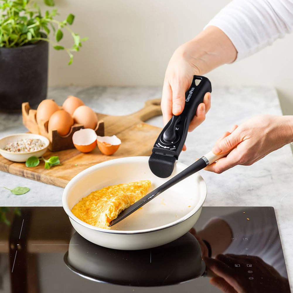 毎日頻繁に使うフライパンだからこそ「安心」も「こびり付きにくい快適さ」も譲れない! ならばフッ素樹脂を一切使わないセラミックコーティング調理器具のパイオニア、グリーンパンを。主に砂と同じ成分の自然由来の塗装で安心して使え、熱伝導率が高く料理がおいしく仕上がります。着脱ハンドルで食卓にそのまま出せる美しいデザインはグリーンパンならでは。洗い物も減り大助かりです。20cm ・26cmのフライパン、ハンドル1本、保護フェルト1枚の4点セット。フッ素樹脂を一切使わないセラミックコーティング調理器具のパイオニア、グリーンパン。主に砂と同じ成分の自然由来の塗装なので安心して使えるうえ、熱伝導率が高く料理がおいしく仕上がります。着脱式ハンドルで食卓にそのまま出せる美しいデザインはグリーンパンならでは。ア)クリームホワイトなら内側も綺麗なホワイトなのでそのまま食卓に出しても、まるでお皿のように美しい。洗い物が減るので本当にうれしい。※画像中央のソースパンは8点セットの商品です。目玉焼きもスルン!ヘルシーなお料理を安心してお召し上がりいただけます。コーティングには主に砂と同じ成分の原料から作られた「サーモロン・セラミック・コーティング」を使用。人体や環境に影響を及ぼす化学物質は一切使われていません。おいしく仕上がる優れた熱伝導性IHはもちろん、様々な熱源に対応する底部には、熱変形に強く、熱伝導性に優れた独自の加工技術「マグニートIH対応加工」を施しています。素早く均一に火が通るので焦げつきにくく、お料理がよりおいしく仕上がります。内面のセラミックコーティングにはダイヤモンド粒子を配合し、セラミックとダイヤモンド粒子の相乗効果により熱伝導が良く、調理が早く仕上がります。フライパン20cmは朝食やお弁当の準備に使い勝手がよいと人気です。深さが約4cmあるので煮込み料理も得意。1人分の調理やサブのフライパンとして使いやすい大きさです。2〜3人分のおかずを調理でき、使い勝手がよい26cmのフライパン深さが約6.5cmあるのでこぼれにくいので調理しやすく、チャーハンなどの炒めものから煮込みハンバーグなどの煮込み料理まで幅広く活躍します。ハンドルが取り外せることで、収納性も調理の幅もグンとアップします。フライパン本体は最大260°Cの高温にも耐えられるのでオーブン調理が可能です。着脱式ハンドルは取り付けも取り外しもスムーズ。取り外す際は2段階のロックシステムにより滑り落ちなどを防止します。フライパン本体は食洗機に対応!ハンドルが取れるので食洗機にも入れやすく、庫内のスペースも無駄にしません。 ※ハンドルは食洗機をご使用いただけません。洗い物の際のストレスを軽減!ハンドルを外せば狭いシンクでもラクラク洗えます。外面までセラミックコーティングされているので汚れはサッと落ちます。世界100カ国以上で展開され、ヘルシーで安全、耐摩耗性に優れたクックウェアブランドとして世界中で愛されています。従来の加工材料であるフッ素樹脂を一切使用せず、PFASを含まないノンスティック加工を施した製品を開発。世界100カ国以上で展開され、ヘルシーで安全、耐摩耗性に優れたクックウェアブランドとして、プロの料理人から料理愛好家まで世界中で愛されています。
