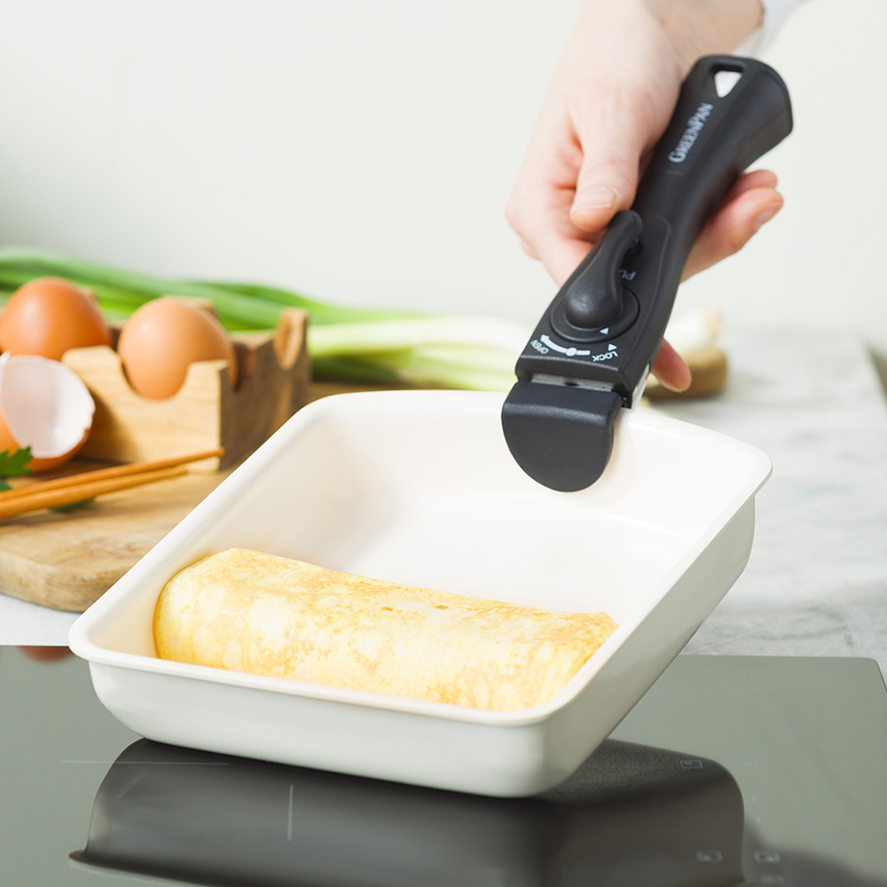 フッ素樹脂を一切使わないセラミックコーティング調理器具のパイオニア、グリーンパン。主に砂と同じ成分の自然由来の塗装なので安心して使えるうえ、熱伝導率が高く料理がおいしく仕上がります。エッグパンは、玉子焼きはもちろん、スパニッシュオムレツやキッシュ、少量のおかず作りにぴったり。ハンドル脱着式グリーンパン【クリックシェフシリーズ】エッグパンの単品販売です。卵焼きはもちろんスパニッシュオムレツやキッシュ、ちょっとしたおつまみや1人分のおかず作りにもピッタリです。※ハンドルは付属しませんのでご注意ください。※本製品は必ずグリーンパン「クリックシェフシリーズ 専用ハンドル」とご使用ください。その他メーカーのハンドルはご使用になれません。