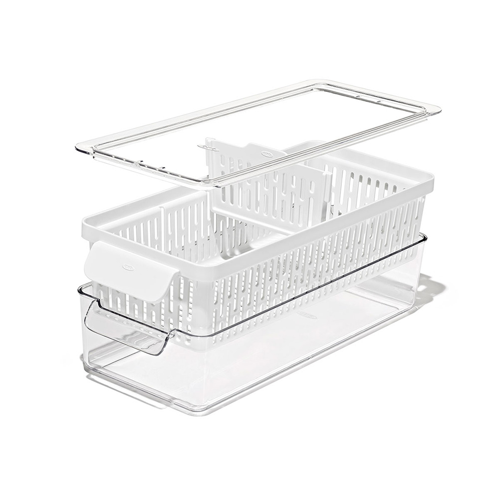 透明コンテナ、バスケット(ザル)、フタ、仕切り板のセット。全パーツ分解出来て衛生的です。