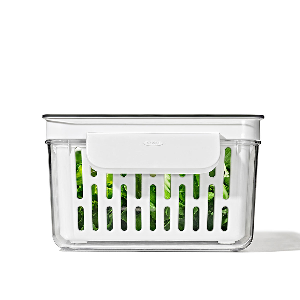 通気性のよいコンテナ容器で野菜や果物を保存!冷蔵庫もすっきり整理できます。通気性のよいバスケット(ザル)付きのクリアなコンテナ容器。冷蔵庫内をすっきり整理Mサイズはトマトやきゅうりなどの収納に便利。Lサイズはキャベツなど嵩張る野菜を収納可能。ロングサイズは小松菜やほうれん草などの葉物野菜にぴったりです。大きなボウルとザルの代わりとしても。そのまま冷蔵庫へ入れられて便利コンテナとバスケットを重ねた状態で野菜を水洗い、バスケットを持ち上げればザルのように水切りが可能。コンテナとバスケットのそれぞれにハンドルが付いているので、持ち上げたりする動作がしやすい形状です。水が切れたら再度重ねて、フタをして冷蔵庫へ。野菜に残った水分でコンテナ内は適度に湿った状態に保たれます。細かな工夫がたくさんフタ通気孔つきでコンテナ内の余分な湿気を逃し、湿度をコントール。コンテナに差し込んで立てられる仕様で、作業中のフタ置き場にも困りません。バスケットコンテナとの間にすき間ができるよう底上げされていて、食材から落ちた水分が溜まる仕組みです。食材が底に溜まった水滴に触れるのを防ぎ、清潔な状態を保ちやすい。スタッフおすすめ◎使ってみました!今までは野菜を買って来たら、パッケージ等もそのまま冷蔵庫に片づけていました。すると葉物野菜はすぐに使わないとシナっとしやすく、使いかけの野菜は迷子になって気づくと干からびたりしていました…。ちょうど「野菜は買ってすぐ洗ったり下ごしらえすると料理が楽になる」というyoutubeを見ていたので、早速ベジタブルキーパーを活用して実践することに!小松菜をロングサイズをザルとボウルのように使って水洗いし、水を切ってそのまま保管。余分な道具を出さなくて済むのがGOODです。そして適度な湿度のおかげか数日経ってもシャキっと元気な姿に感動!冷蔵庫から出してすぐに調理ができるのも意外とうれしいポイントでした。ミドルサイズには使いかけの野菜をポイポイ放り込んでいます。ラップをしなくてもいいので手間が省け、エコにもなってとっても良かったです!フタが透明なので今使うべき野菜がひと目で分かるのも便利です。価格高騰のこの時代に、貴重な野菜を無駄なく楽しめるおすすめアイテムです。※個人の感想です。