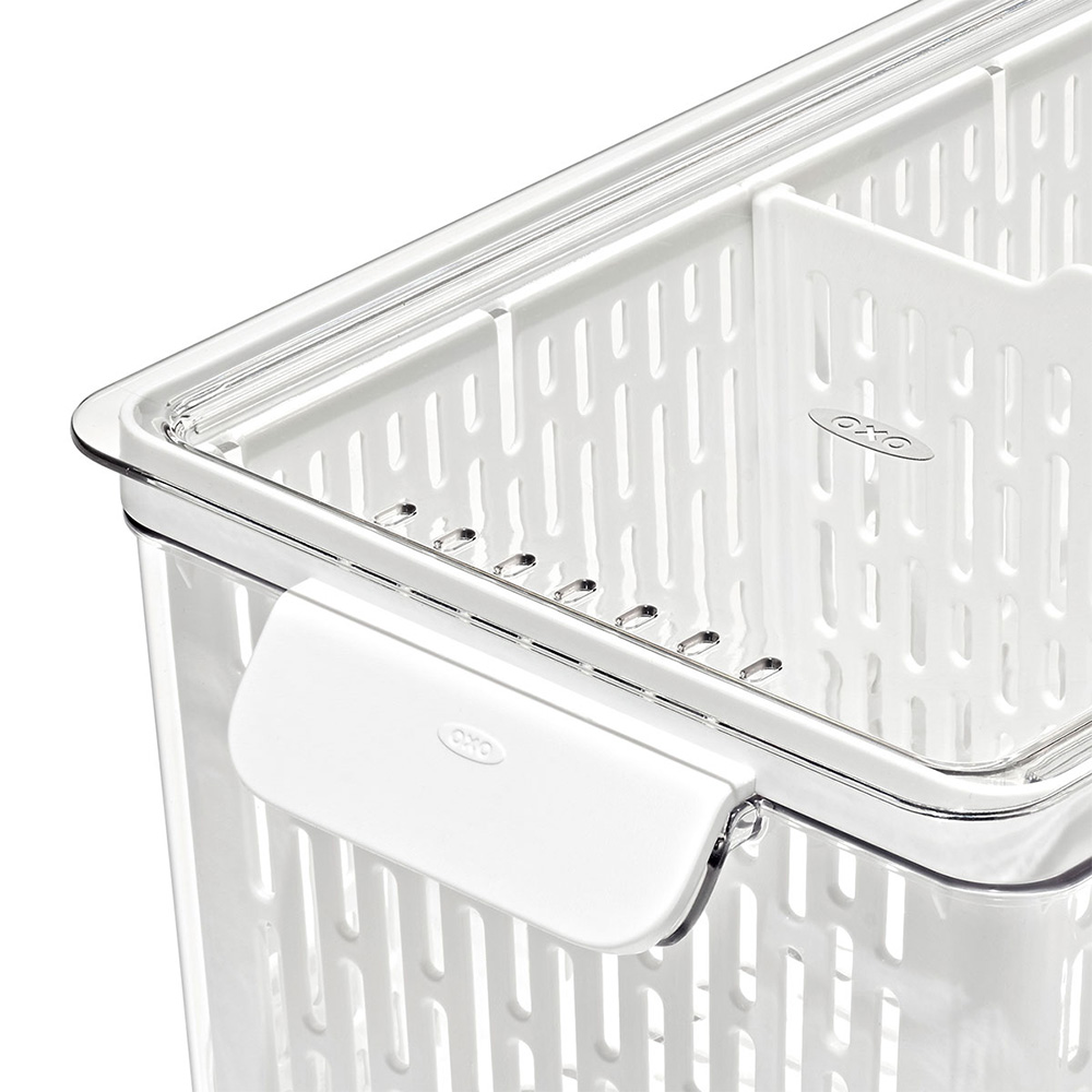 底上げバスケット。コンテナ容器との間にすき間が生まれ、丸洗いした野菜についた余分な水分が溜まる仕組みです。野菜を清潔に保てます。
