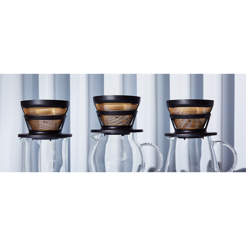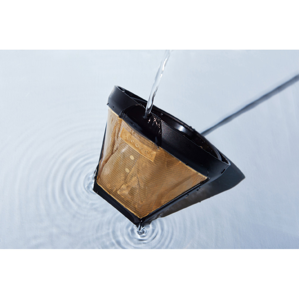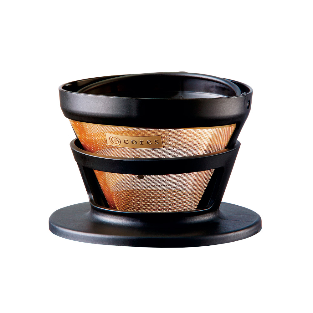 純金コーティングされた特別なフィルターです。ペーパーレスで環境に優しく、豆本来の香り高い風味をクリアに抽出。雑味のない、上質な一杯が、いつものコーヒータイムを豊かなひとときへと誘います。日々のコーヒータイムを、上質なひとときに。コレス ゴールドフィルター忙しい日々の中で、ほっと一息つくコーヒータイム。そのひとときを、もう少しだけ特別なものにしませんか。Cores GOLD FILTER(コレス ゴールドフィルター)は、純金コーティングされた金属製コーヒーフィルターです。ペーパーフィルターを使わず、コーヒー豆が持つ本来の風味や香りをダイレクトに引き出し、すっきりと雑味のない、まろやかな味わいをお楽しみいただけます。デイリーなコーヒーはもちろん、こだわりのスペシャルティコーヒーにもおすすめです。純金が叶える、コーヒー本来のクリアな香りCores ゴールドフィルターの最大の特長は、フィルターに施された「純金コーティング」です。純金は化学的な変化を起こしにくいため、コーヒーのデリケートな風味や香りに影響を与えることがありません。これにより、淹れたてのコーヒーが持つ、豆本来の豊かなアロマや繊細な味わいを、そのままカップにお届けすることができるのです。またカビや臭いも付きにくく、衛生的に保てます。オイルを逃さず、高温短時間抽出ができるよう 計算されたメッシュ構造メッシュ穴はよく見ると縦長です。この独自の縦長メッシュ構造は、コーヒー豆からコーヒーオイルや風味を余すことなく抽出し、同時に目詰まりしにくい設計になっています。これにより、雑味を抑えながらも、スペシャルティコーヒーが持つフルーティーな個性や、深く豊かなコクをクリアに感じていただけます。地球にも、暮らしにも優しい選択を使い捨てのペーパーフィルターは、もう必要ありません。「ペーパーレス」で使えるため、環境への配慮が自然と日々の習慣になります。フィルターの買い置きの手間もなくなり、ゴミの削減にも貢献。環境に優しいエコロジカルな選択は、あなたの暮らしをより豊かにしてくれるでしょう。スピーディーな抽出を妨げない専用ホルダー付属のオリジナルフィルターホルダーは、フィルターとのコンタクトポイントを最小限にしてスピーディーな抽出を妨げない理想の形。毎日気軽に、本格的なコーヒーをCores ゴールドフィルターは、長く繰り返し使えるので経済的です。さらに、使用後のお手入れも非常に簡単。サッと水で洗い流すだけで、清潔に保つことができます。手間なく手軽に、毎日本格的なコーヒーを楽しみたい方にとって、これほど頼りになるアイテムはありません。忙しい毎日の中でも、質の良いコーヒーで心を満たす時間を大切にしたいあなたに寄り添います。