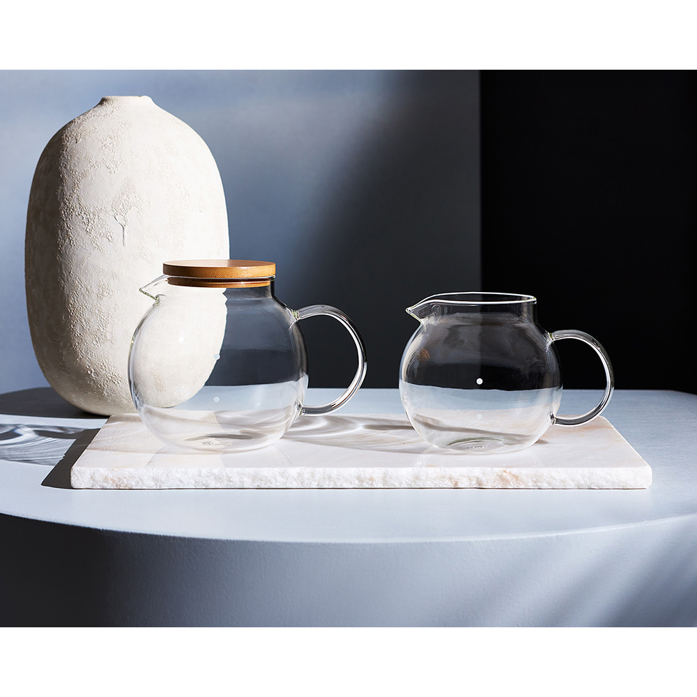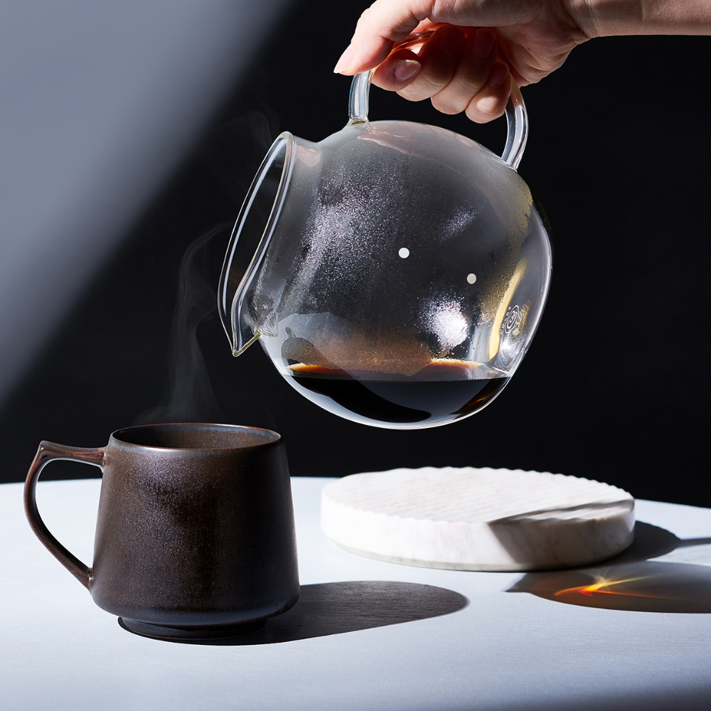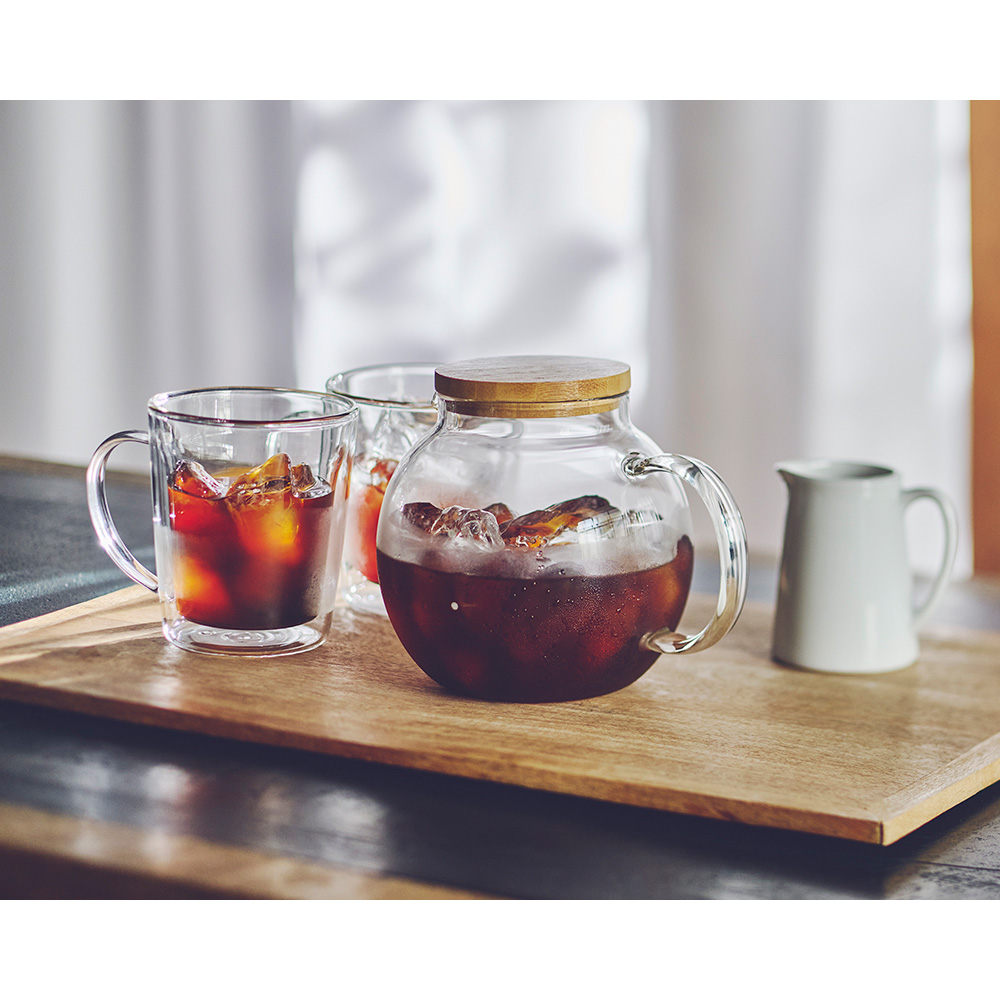 洗練されたデザインで暮らしに溶け込む、ハンドメイドのガラスサーバー。コーヒーはもちろん紅茶や中国茶にも。電子レンジや食洗器も使用OKです。洗練されたデザインで暮らしに溶け込む、ハンドメイドのガラスサーバー手作りのガラスと天然バンブー(竹)を組み合わせた、温かみと清潔感が同居する上質なガラスサーバー。インテリアとしての存在感も楽しめる、大人のコーヒータイムに相応しいアイテムです。フタを外せば電子レンジや食洗機にも対応する実用性も兼ね備えています。2サイズで使い分ける、ライフスタイルに合わせた選択ハンドドリップ用として4杯用(500ml)と6杯用(750ml)の2サイズをご用意。朝の一人時間や、友人とのおもてなしなど、シーンに合わせてお選びいただけます。容量が一目でわかる便利な目盛りは、MAXとHALF位置に配置されています。微粉を抑えた、クリアな一杯を実現する丸みのあるデザインで紅茶にもおすすめサーバーの丸い形状は、ゆっくり注ぐことで微粉を側面に留め、クリアな一杯を可能にします。コーヒーだけでなく、ティーポットとしても活躍。茶葉が十分にジャンピングするので、香り高い紅茶やハーブティーも楽しめます。手にフィットする、使い心地を考えた機能美注ぎやすさを追求した丸みのある取手は、手にしっくりとフィット。毎日使うものだからこそ、使い心地の良さにこだわりました。温かみのあるバンブーのフタと耐熱ガラスの組み合わせは、キッチンやダイニングを彩るスタイリッシュなアクセントになります。