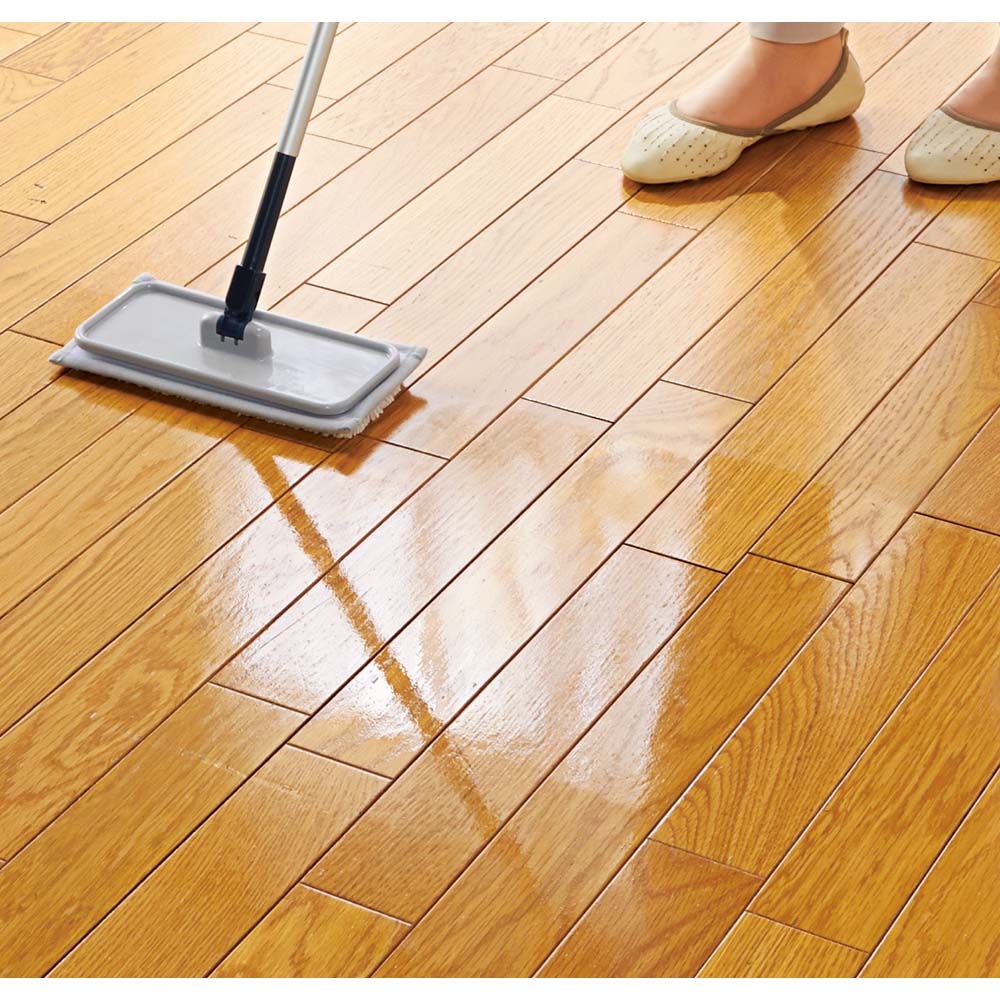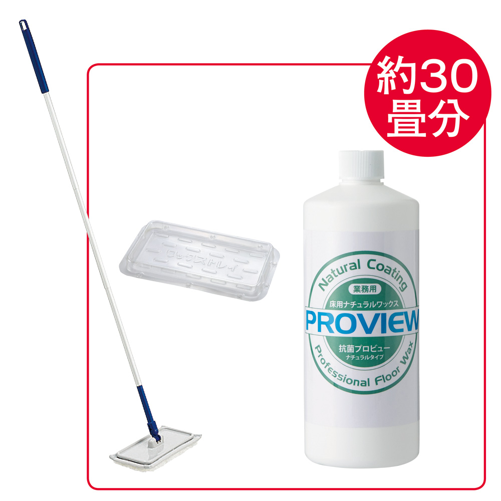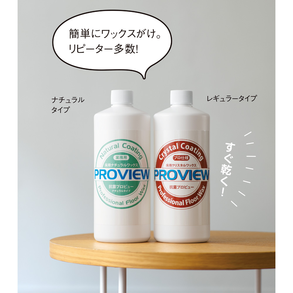 「ワックスがけが簡単に!抗菌プロビュー」サッと塗れて乾きもスピーディ。しかも効果が約6カ月も持続!ワックスらしいピカピカ感の「レギュラータイプ」と、光沢控えめでフローリングの質感を生かせるマットな風合いの「ナチュラルタイプ」の2つのタイプからお好みをお選びください。 ※モップは付属しません耐久性にすぐれた皮膜で、ピカピカ効果は約6カ月。床をキズや汚れから守るだけでなく、スリップ防止や抗菌効果も備えています。ベタベタ床は気持ちが悪いこの時期はカーペットを外してフローリングにするご家庭も多いのでは。フローリングはダニが少なく清潔なはずですが、湿気がたまるとベタベタと気持ちが悪く、雑菌の繁殖も心配です。そこでお薦めしたいのが『床用ワックス“抗菌プロビュー”』。業務用の中でもとくに床に関わる雑菌に強く、しかも安全性の高い抗菌剤を採用。ペットのいるご家庭にも最適です。滑りにくいマニキュアタイプ市販のワックスにありがちな滑りやすい、長持ちしない、塗るのが面倒といった悩みを解消しました。ウレタン樹脂とアクリル樹脂を特殊配合した高級タイプのためで、粒子が細かく密着性に優れ、薄く塗るだけで強力な皮膜を作ります。ウエット感のある光沢が美しく、耐久性もgood。滑りにくく足触りもソフト。伸びが良く乾きが早く、から拭き不要で初めての方でも6畳間が5分程度で完了します。アクリル樹脂成分と、特殊高分子ポリマー成分をバランス良く配合することで、◎光沢の長期持続性◎ツヤ出しの為のカラ拭き不要◎塗りムラが出来にくい◎耐水性がある◎スベリにくく、幼児やお年寄りのいるご家庭でも安心。etc.の特長1000mlで1度塗りの場合約60畳、2度塗りの場合約30畳分使用可能。フローリング床、クッションフロアー、ニス塗り床、Pタイルなど各種床材の保護とツヤ出しに。注意:特殊床材によっては、ワックスが塗布できない場合があります。目立たない場所で試してからご使用下さい。【使用できない床】油加工された床(オイルステイン、ロウ仕上げ等)、油性ワックスを使用した床、塗装されていない木床(白木床等)、特殊な床(ウルシ、鏡面仕上げ等)、石床、塗装(表面加工)されていないコルク床等