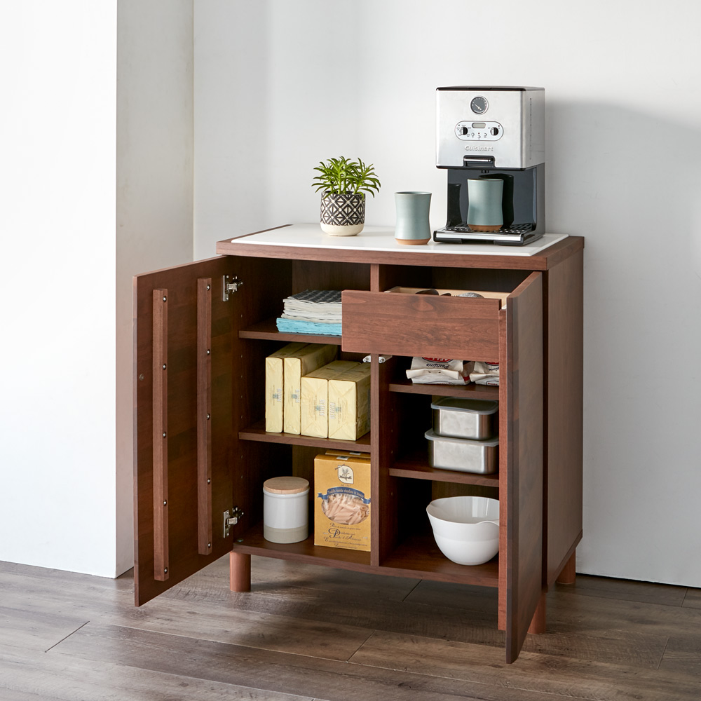 滑らかな丸みを持たせたデザインの、上質感が漂う北欧家具風キッチン収納。 ※お届けは(写真右)カウンター幅80cmです。