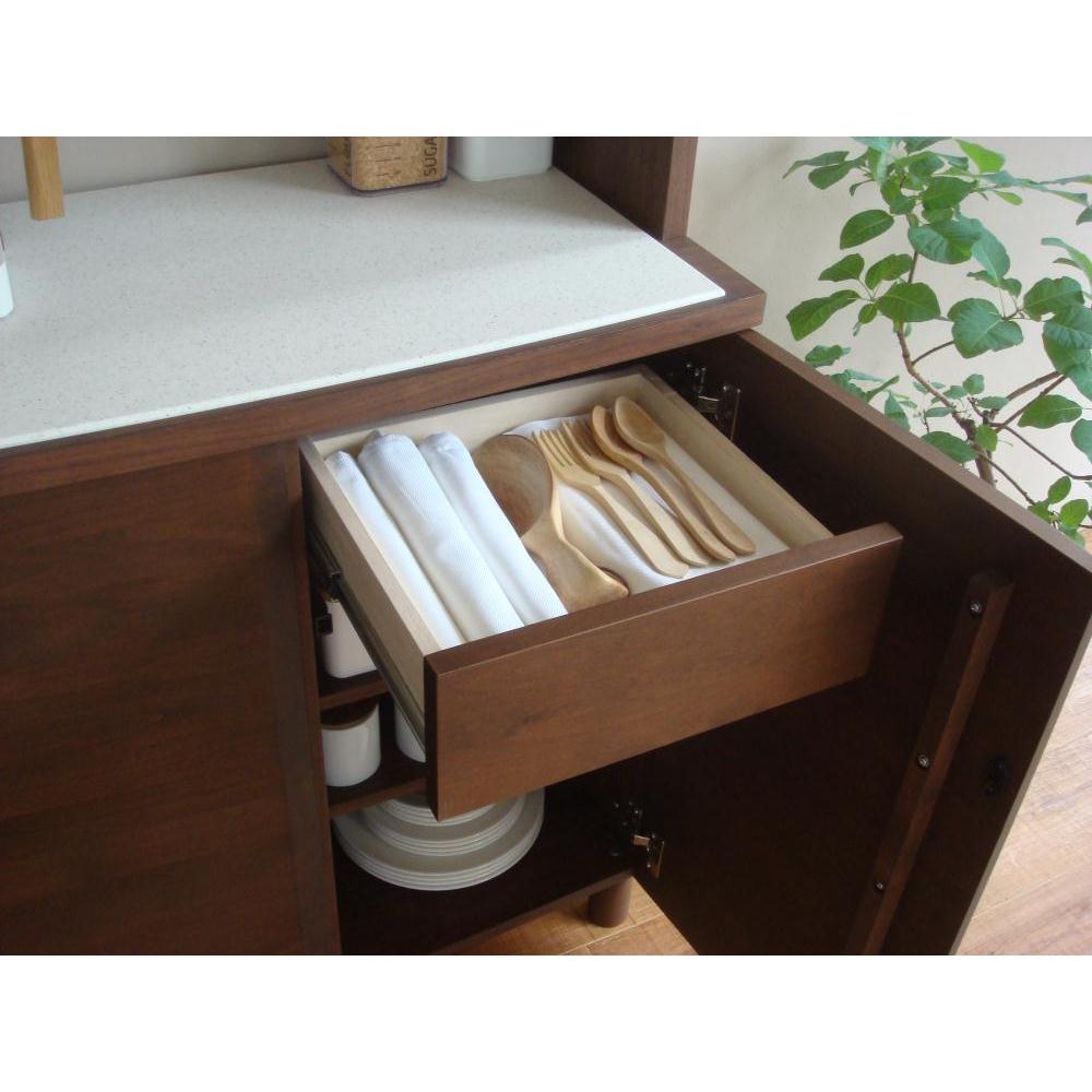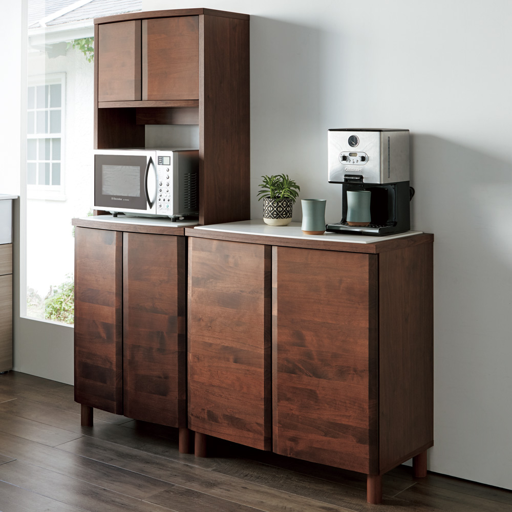 柔らかでナチュラルな雰囲気が北欧風を演出するキッチン収納。柔らかなカーブをつけたアールデザインが天然木の風合いをさらに引き立てる家電台です。人工大理石天板など機能も充実。アルダー天然木 アールデザインシリーズ前面のなめらかなカーブが優雅ささえ感じさせる美しいフォルムのキッチン収納シリーズ。アルダー無垢材の前板が、おしゃれなキッチンインテリアにぴったり。美しい姿だけでなく、機能面にもこだわったアイデア収納です。どうしても生活感があふれてしまう台所をセンス良くまとめるのに一役買ってくれそうです。北欧家具を思わせるやさしい雰囲気が圧迫感を感じさせないので、狭いキッチンにおいても。熱に強くお手入れ簡単な、人工大理石を使用したキッチン収納◆前面に合わせやわらかくカーブを描く天板は熱や汚れに強い人工大理石でできています。◆耐荷重30kgで大型レンジの家電収納としてはもちろん、調理台としてもご使用いただけます。◆パン生地をこねるなどの本格的な趣味の料理から、ちょっとした調理の際にも便利です。◆人工大理石に傷がついても、サンドペーパーでやさしく磨けば元通りになるので、家電ラック、レンジラックとして安心してお使いいただけます。◆人工大理石は傷や手垢が目立たない、扱いやすい素材です。天然木でもお手入れ簡単、水周りでも安心なウレタン塗装◆優しい風合いと存在感が魅力の天然木だけれど、お手入れが面倒…?そんなことはありません。◆天然木部分にはウレタン塗装を施し、水や汚れに配慮。さっと拭き取れば元通りの美しさに。◆ウレタン塗装は一般的なダイニングテーブルにも使用されるものです。◆天然木の表情がまるで憧れの輸入キッチンのような雰囲気を感じさせてくれるレンジ台です。収納ボリュームもたっぷり、収納力が自慢のキッチンカウンター◆引出しには全段フルスライドレールを採用。奥までスムーズに引き出せるので出し入れが楽々。◆カトラリーから小皿、散らばりがちなキッチンアイテムまで安心して収納できる食品ストッカー・キッチンストッカーとしても重宝します。◆開き戸部分には可動棚板をセット。たっぷり収納できるので、食器などを収納してカップボード、キッチンボードとしても。生活感を感じさせない優雅なフォルムで絵になる家電ラック◆前面のなめらかな曲面が美しいシルエットがアルダー天然木の木目をさらに引き立てます。◆シルエットや前面のカーブの美しさを際立たせるため、あえてプッシュ開閉式の扉に。◆美しい木目と無垢材の前板で、北欧インテリアにも調和するかわいいキッチンに。◆このシリーズでお客様にも見ていただきたくなるほどの余所行き顔のキッチンにしてみてはいかがでしょうか?安心の資材と国内生産のキッチンラック◆素材はJIS規格の定める安全性の高いF☆☆☆☆を使用しました。◆国内の職人が丁寧に仕上げた安心の日本製の食器棚・ダイニングボードです。