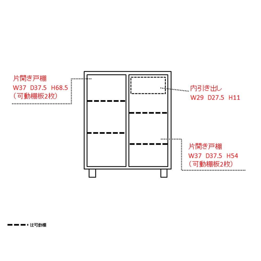 5cm間隔で高さ調整可能な収納棚板は4枚付いています。