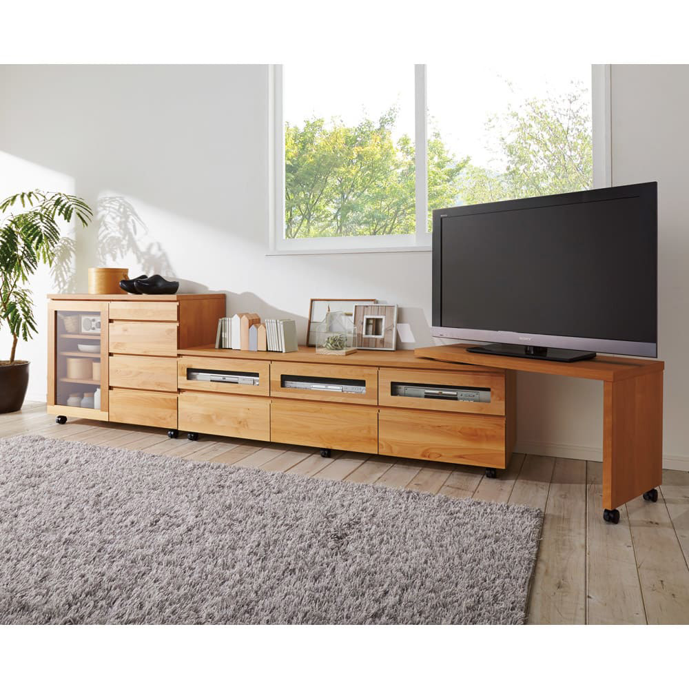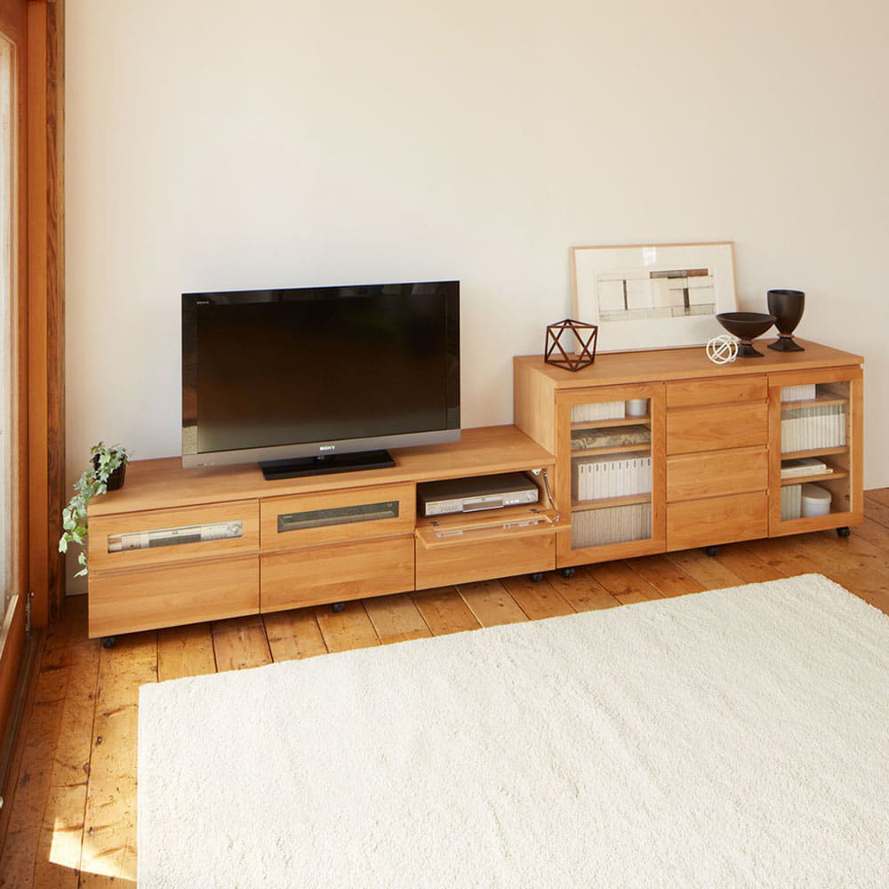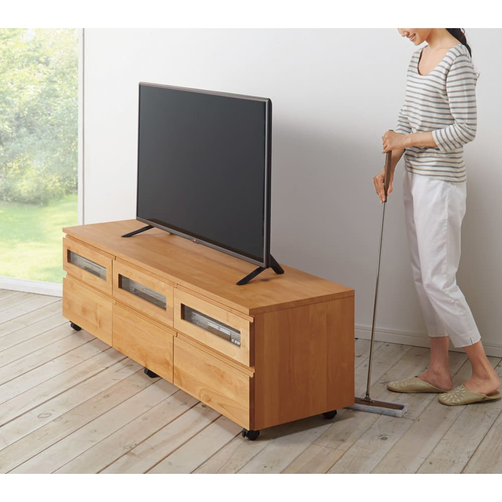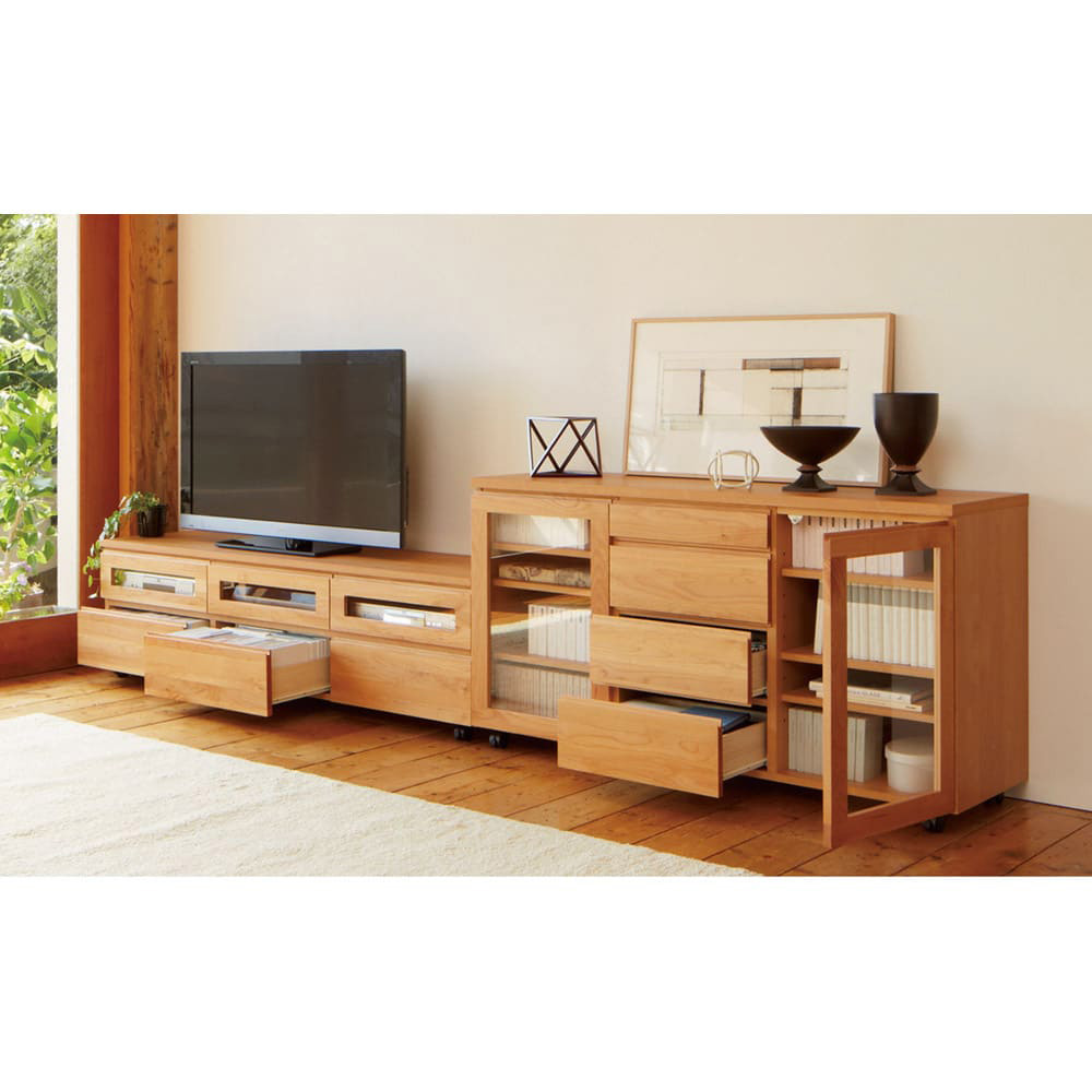 テレビを載せたまま、見やすい場所に移動できるキャスター付きのテレビ台。65Vまでの大型テレビにも対応するサイズで、北欧風のアルダー天然木の温かみが寛ぎの空間を演出します。上質なクラシックが似合う天然木の実力。●アルダー天然木の温もりが身も心もワンランク上の生活へと誘います。●テレビボードを中心に、キャビネットやデスクなどもシリーズで揃えられ、安らぎと寛ぎあふれるリビング収納空間を作り出します。●2005年7月発売開始以降、その格調高い風格と暮らしに快適な機能がロングセラーの秘密です。お客様満足度91%の高評価を頂戴しています。【家具職人の想い】●家族とともに成長できるよう細部までこだわり心を込めて作り上げています。【製品情報】[色の種類]●高級感のある落ち着いた印象のダークブラウン。●柔らかさと癒しの眼差しライトブラウン。[サイズ・バリエーション]●大画面薄型液晶テレビにも対応できるテレビ台の幅は、106cm、159cm。●DVDレコーダーやデッキ収納に適したキャビネットの幅は90.5cm、135.5cm。●パソコン作業や趣味に没頭できるデスクは、幅100cm。●薄型デスクに合わせて機動力のあるデスクサイドチェストワゴン。●テレビ台に組み合わせて、伸縮、角度調節可能なコーナーテレビ台使用が実現するスイング天板ネストボード。[仕様]●キャスター付きで、テレビとゲーム機との配線やお掃除や模様替え、リフォーム、新生活をお手軽にリフレッシュ(デスク除く)。●引き出しは、スライドレール付きで開閉楽々。DVDやゲームの収納が快適です。●32〜65Vの大型テレビに適しています。●デッキ収納部は、フラップ扉仕様でリモコン透過性の良いガラスを採用、閉じたまま操作可能です。●デッキ収納部には2口コンセント付き。のスペース有効活用に快適な力を発揮します。●引き出しも安心で快適なスライドレール付き。●別売りの「ネストボード」と組み合わせてお部屋のコーナーで使用することができます。【活躍空間】●リビングルームの主役を支えるTVボードユニットとして。●寝室のおしゃれで格調高いテレビコーナーとして。【担当者からのメッセージ】●高級楽器などにも使われるアルダー材の手触りとその表情が暮らしを底上げする力を宿しています。●安心の国産、日本製。完成商品ですので、届いたら直ぐ設置いただけるのもお勧めポイントです。●新生活にもおすすめのテレビ台です。