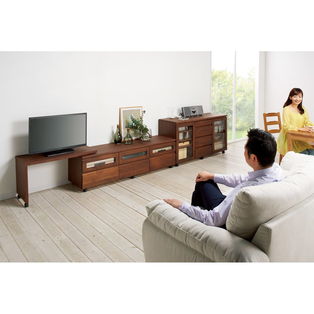 コーディネート例(イ)ダークブラウン リビングから。ネストボード(別売り)は左右どちらにも取り付けられ、幅伸縮や角度調整が自在に。
