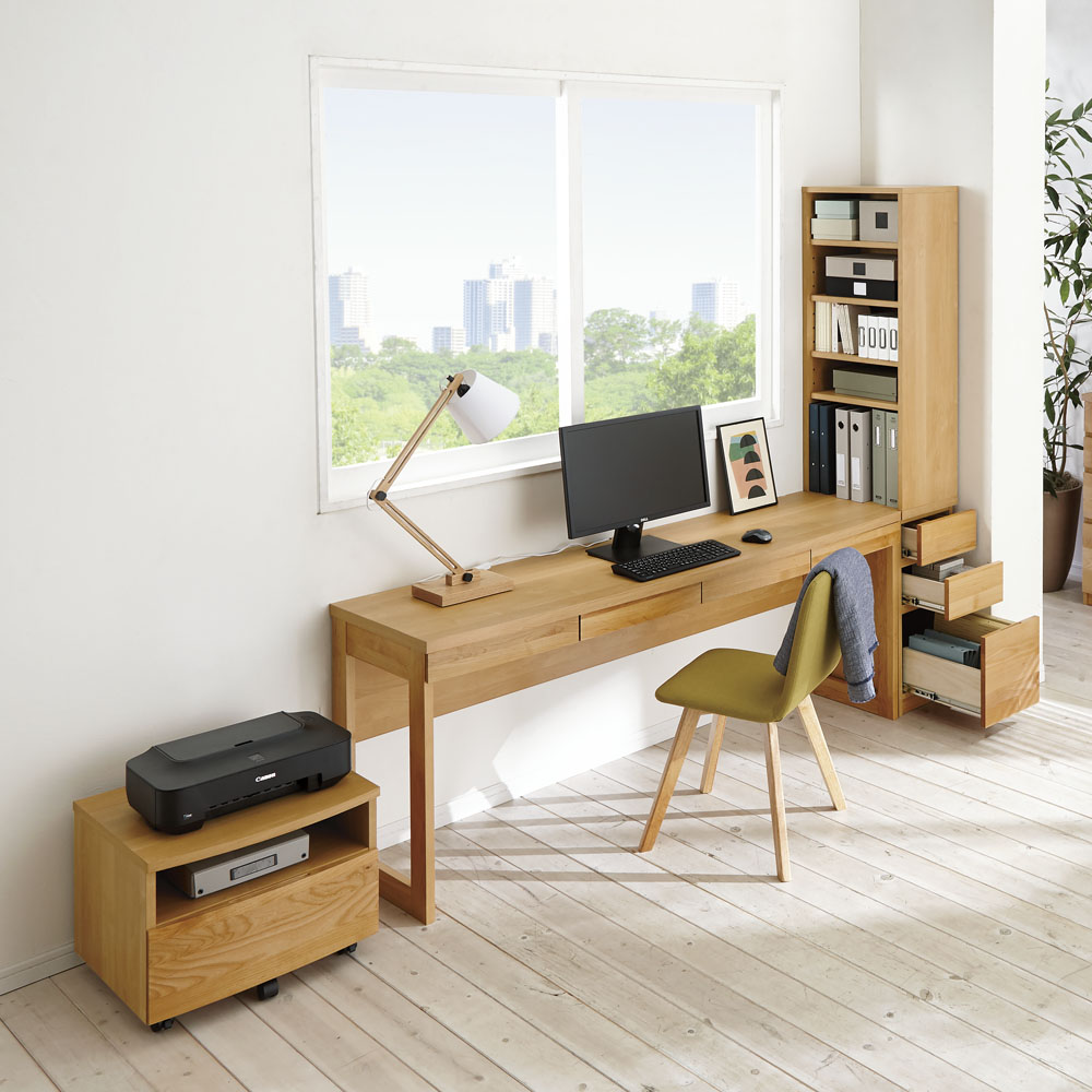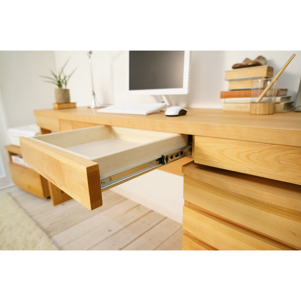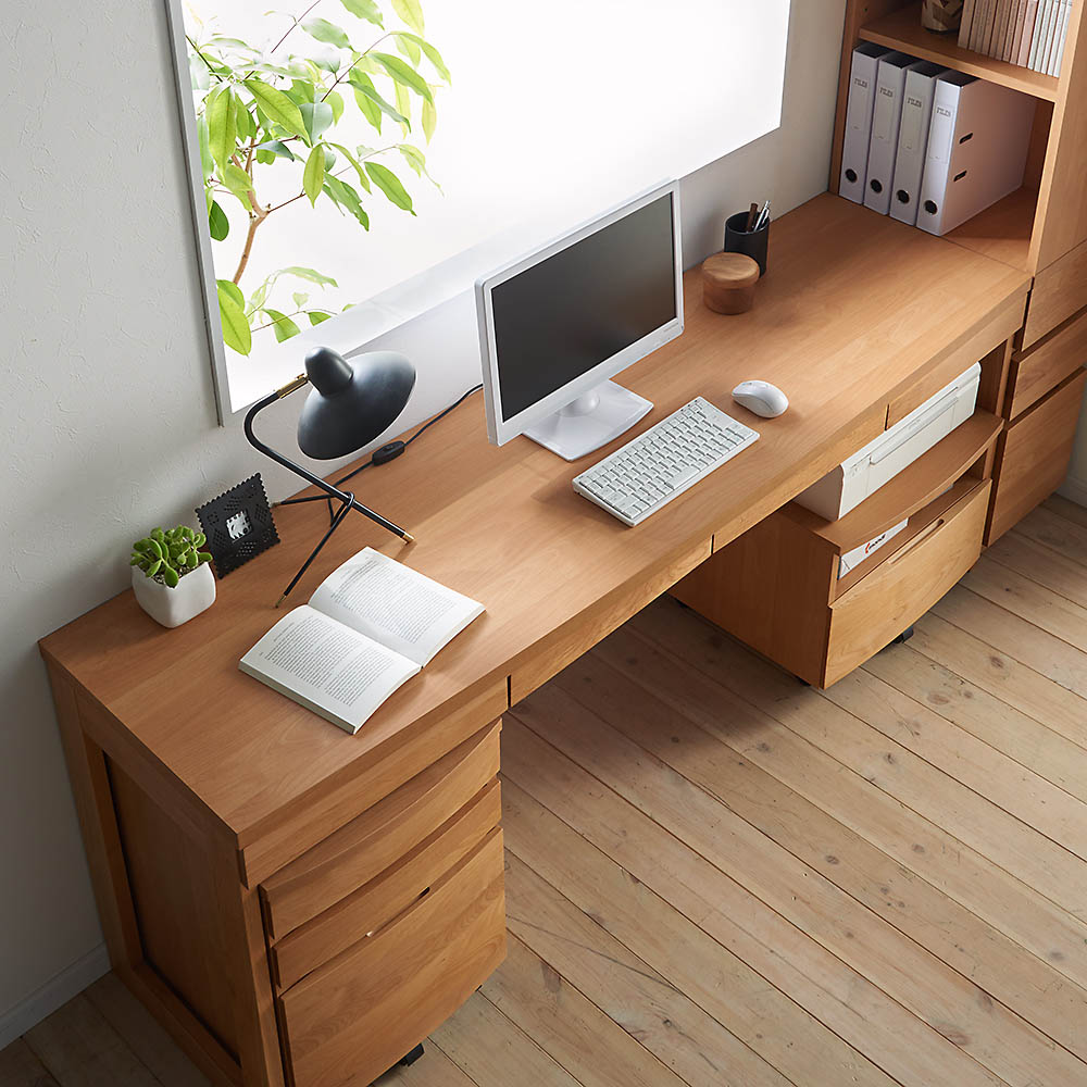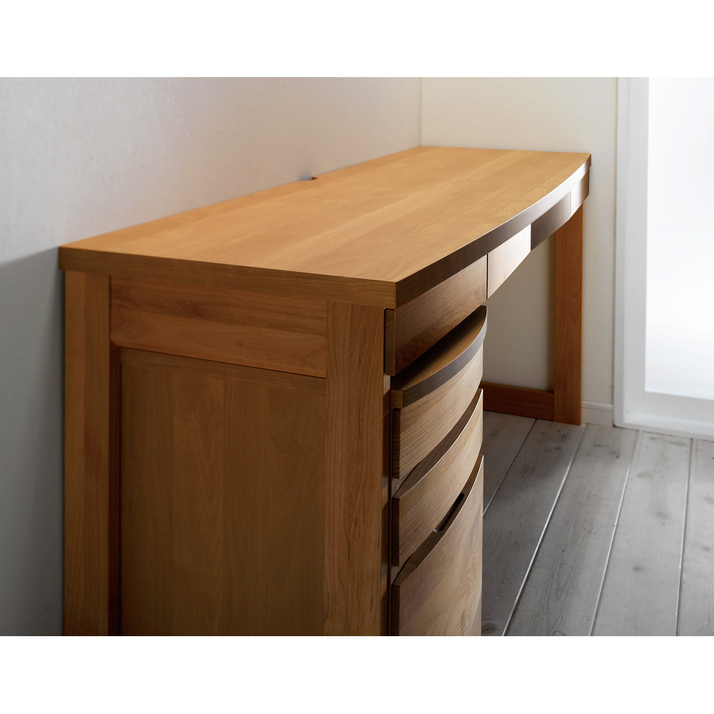「しっとりとした質感となめらかな曲線美が見事に調和したデスクシリーズ」上質な素材と美しい曲線が織りなす、心安らぐクリエイティブなひととき。お部屋を格調高くコーディネイトする、SOHOにおすすめな、北欧風のおしゃれな木製パソコンデスク。丸みのあるアルダー天然木が醸し出すやさしくて柔らかなパーソナルタイムに包まれて◆バイオリン・ギターに使われる、人気のアルダー材を使用。 無垢材を贅沢に使用しており、触りたくなる上質感です。◆アールデザインが、柔らかく品のある印象を際立たせます。◆ナチュラルなデザインはグリーンとの相性もよく、 インテリアとしてもオシャレな印象のワークデスク。◆天板には配線穴、背面にはコンセントタップ収納があるので ごちゃつきがちなコード類もスッキリさせられます。◆引き出しは箱組と呼ばれる頑丈な造り、 フルスライドレール付きで開閉や出し入れもラクラクです。◆薄型省スペース設計の机は、書斎からリビングやダイニング ベッドルームまで幅広いシーンで活躍します。◆優れた素材&国内の職人による丁寧な仕上げは、 子どもの学習机やリビング学習デスクとしてもおすすめ。◆組立不要の完成品でのお届けで、すぐにお使い頂けます。◆別売りの同シリーズアイテムで空間をコーディネート。 PCデスク、サイドラック、チェスト、プリンターワゴン〜同様のアールデザインで下記の商品もご用意しております〜アルダー天然木アールデザインテレビ台・チェスト・キャビネット・サイドボード