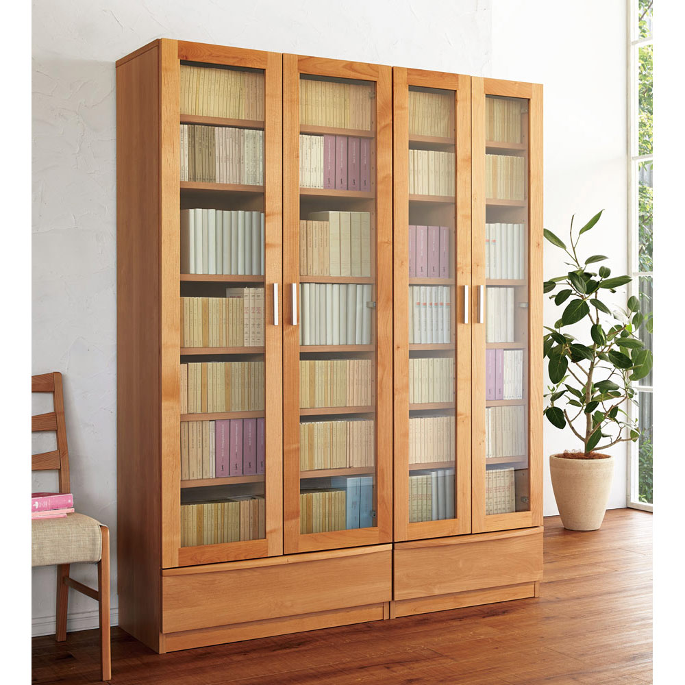 【日本製(国産)】アルダー天然木とガラス扉が織りなす大人の北欧風インテリア。ゆっくりとしまる扉で静けさに満ちた読書空間を堪能できます。【POINT 1】 静けさに満ちた、心安らぐ読書空間を堪能できます。◆優しい木目が特徴のアルダー天然木を贅沢に使用した木製本棚。◆扉は静かにゆっくり閉まるソフトクロージングで、本の出し入れも快適です。◆取っ手はスタイリッシュなシルバーで、書斎やオフィスをナチュラルモダンに彩ります。【POINT 2】 棚板1枚あたり「約30kg」の頑丈設計。◆気品にあふれた佇まいながら、安心の頑丈設計。◆さらに、棚板はねじ込みダボで、しっかりと固定できます。【POINT 3】 日々の使いやすさにもこだわりました。◆便利な引き出し付きで、小物収納もお任せ。◆幅木カットがほどこされ、壁にピッタリと設置できます。◆大量収納ができ、文庫本、コミック、雑誌、CD・DVDなどをすっきり収納するのにも便利です。◆安心の日本製(国産)。職人が心を込めて丁寧に仕上げます。◆F☆☆☆☆の素材でホルムアルデヒドの発生を最小限におさたグレード。お子様のいるご家庭でも安心です。◆面倒な組立は不要。届いてすぐにお使い頂ける、人気の完成品タイプです。