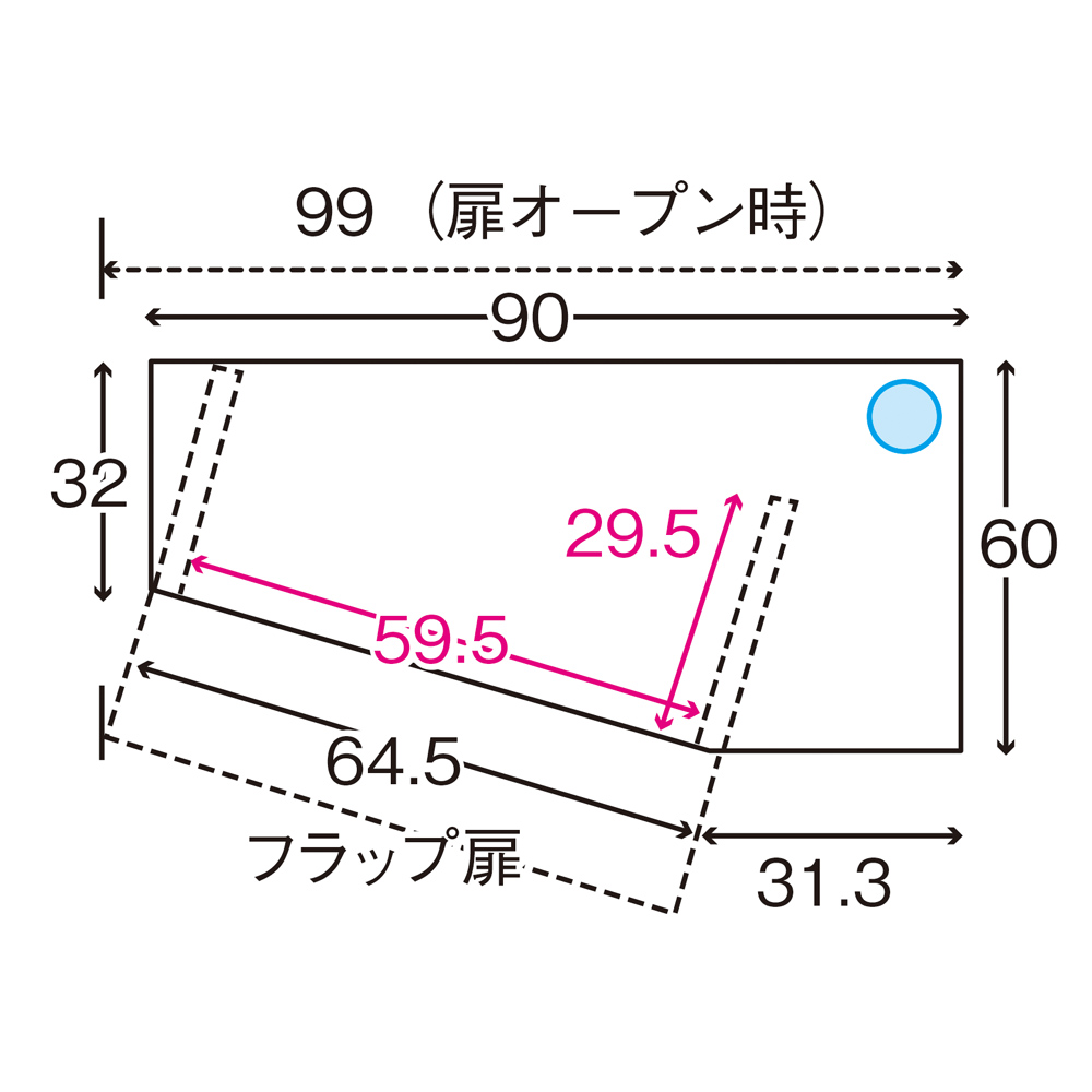 平面図 ※赤文字は内寸(単位:cm)※青色部分はコード穴 ※デッキ収納部内寸高さ24cm ※左コーナー用は左右が逆の仕様です。