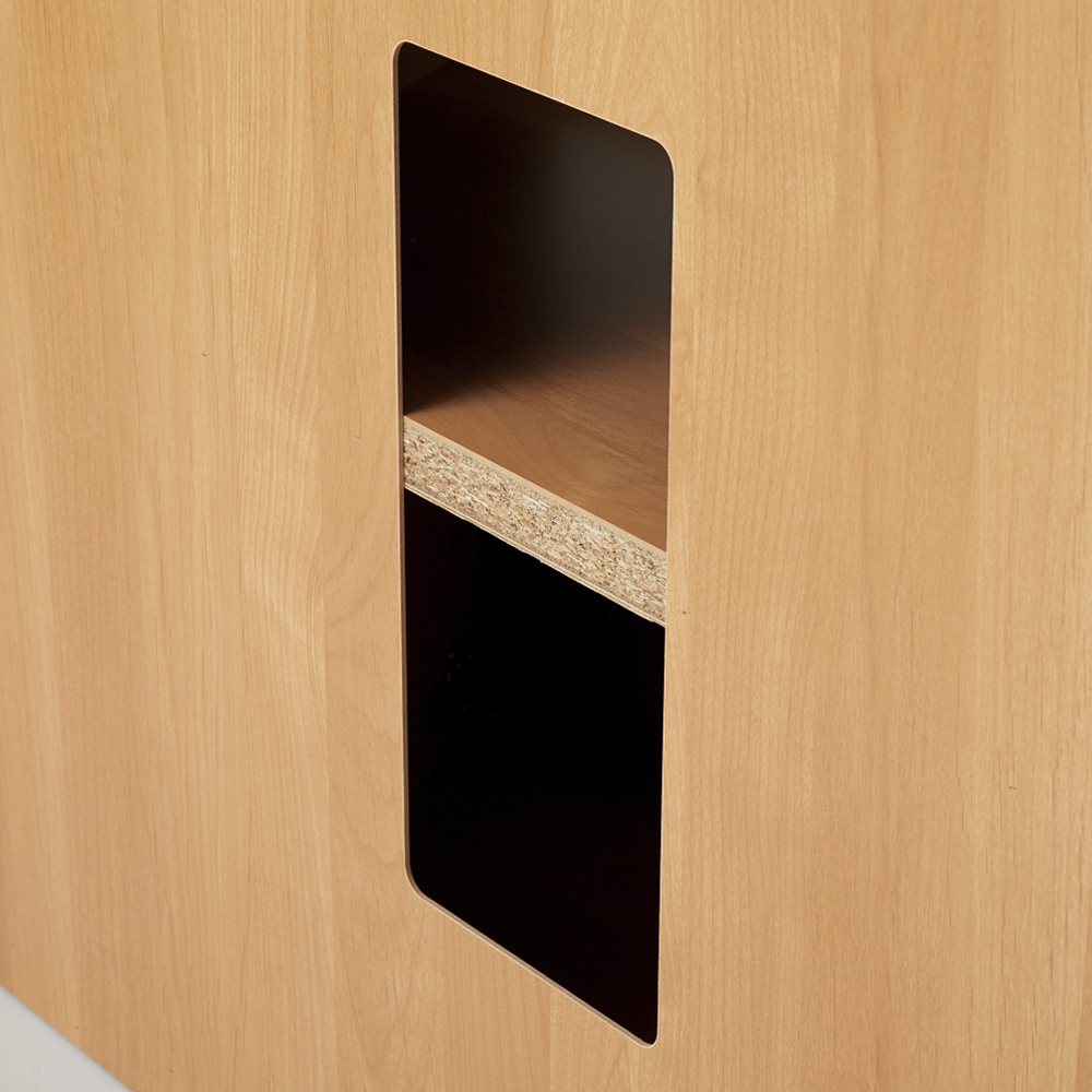 可動棚の付いたフラップ扉式のデッキ収納部。