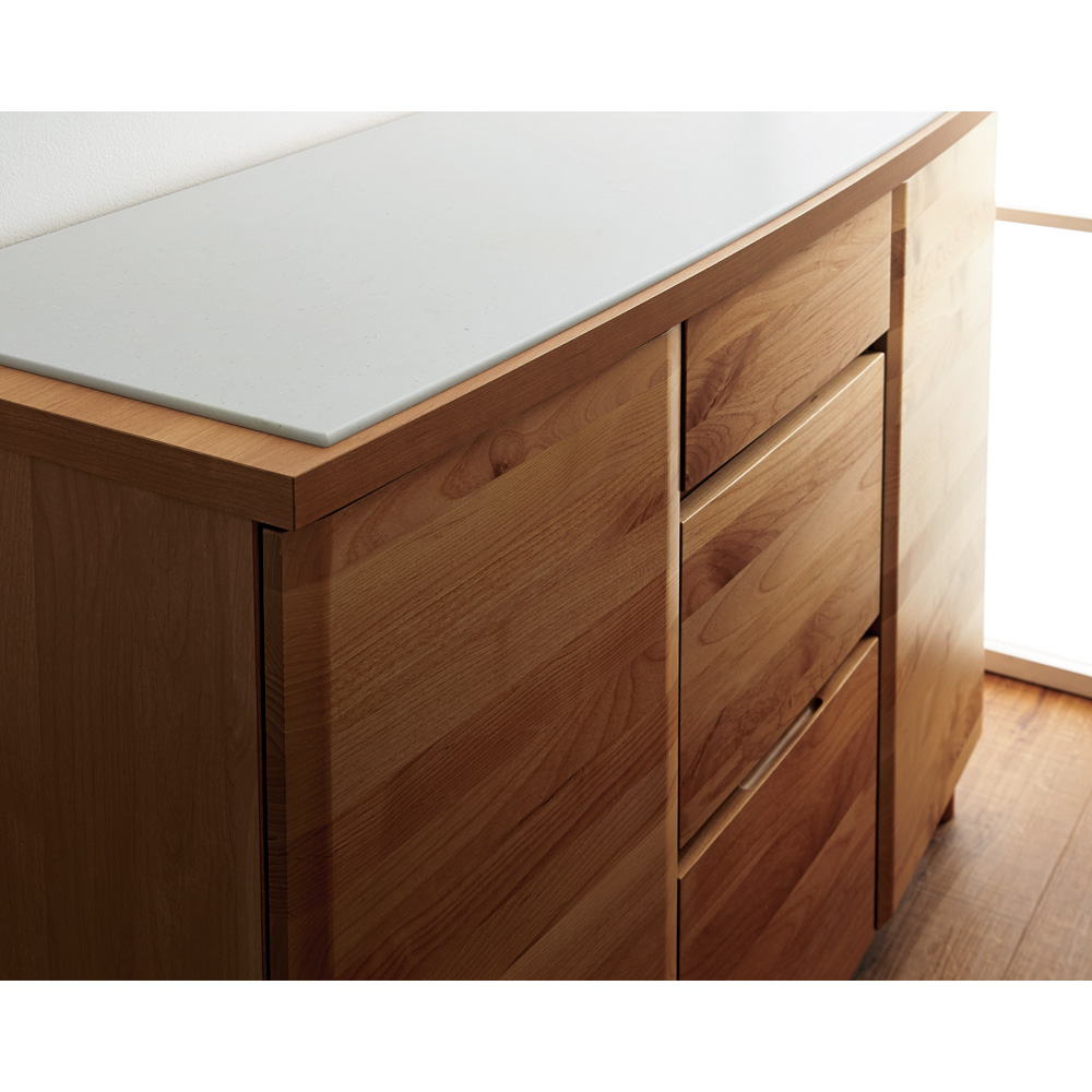 柔らかでナチュラルな雰囲気が北欧風を演出するキッチン収納。柔らかなカーブをつけたアールデザインが天然木の風合いをさらに引き立てる家電台です。人工大理石天板など機能も充実。アルダー天然木 アールデザインシリーズ前面のなめらかなカーブが優雅ささえ感じさせる美しいフォルムのキッチン収納シリーズ。アルダー無垢材の前板が、おしゃれなキッチンインテリアにぴったり。美しい姿だけでなく、機能面にもこだわったアイデア収納です。どうしても生活感があふれてしまう台所をセンス良くまとめるのに一役買ってくれそうです。北欧家具を思わせるやさしい雰囲気が圧迫感を感じさせないので、狭いキッチンにおいても。熱に強くお手入れ簡単な、人工大理石を使用したキッチン収納◆前面に合わせやわらかくカーブを描く天板は熱や汚れに強い人工大理石でできています。◆耐荷重30kgで大型レンジの家電収納としてはもちろん、調理台としてもご使用いただけます。◆パン生地をこねるなどの本格的な趣味の料理から、ちょっとした調理の際にも便利です。◆人工大理石に傷がついても、サンドペーパーでやさしく磨けば元通りになるので、家電ラック、レンジラックとして安心してお使いいただけます。◆人工大理石は傷や手垢が目立たない、扱いやすい素材です。天然木でもお手入れ簡単、水周りでも安心なウレタン塗装◆優しい風合いと存在感が魅力の天然木だけれど、お手入れが面倒…?そんなことはありません。◆天然木部分にはウレタン塗装を施し、水や汚れに配慮。さっと拭き取れば元通りの美しさに。◆ウレタン塗装は一般的なダイニングテーブルにも使用されるものです。◆天然木の表情がまるで憧れの輸入キッチンのような雰囲気を感じさせてくれるコンパクトレンジ台です。収納ボリュームもたっぷり、収納力が自慢の食器棚◆引出しには全段フルスライドレールを採用。奥までスムーズに引き出せるので出し入れが楽々。◆カトラリーから小皿、散らばりがちなキッチンアイテムまで安心して収納できる食品ストッカー・キッチンストッカーとしても重宝します。◆開き戸部分には可動棚板をセット。たっぷり収納できるので、食器などを収納してカップボード、キッチンボードとしても。◆広々とした中天板と、たっぷりとした収納力でレンジ、トースター、ホットプレートなどキッチン家電は全てこれ1台にまとめて収納できます。生活感を感じさせない優雅なフォルムで絵になるカップボード◆前面のなめらかな曲面が美しいシルエットがアルダー天然木の木目をさらに引き立てます。◆シルエットや前面のカーブの美しさを際立たせるため、あえてプッシュ開閉式の扉に。◆美しい木目と無垢材の前板で、北欧インテリアにも調和するかわいいキッチンに。◆このシリーズでお客様にも見ていただきたくなるほどの余所行き顔のキッチンにしてみてはいかがでしょうか?安心の資材と国内生産のキッチンラック◆素材はJIS規格の定める安全性の高いF☆☆☆☆を使用しました。◆国内の職人が丁寧に仕上げた安心の日本製の食器棚・ダイニングボードです。