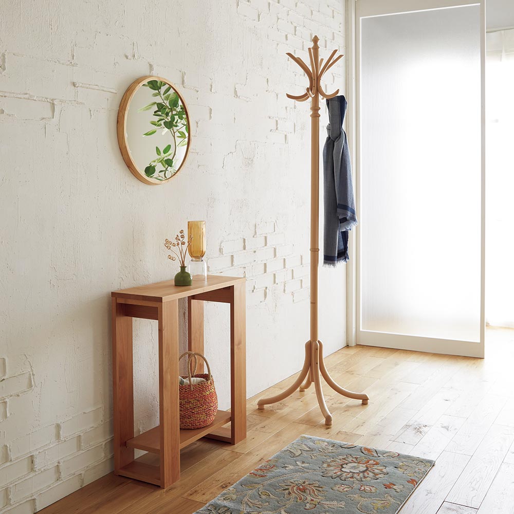 天然木の質感が際立つシンプルなシルエット。奥行きも幅もコンパクトで狭い玄関周りにぴったりなミニテーブル。